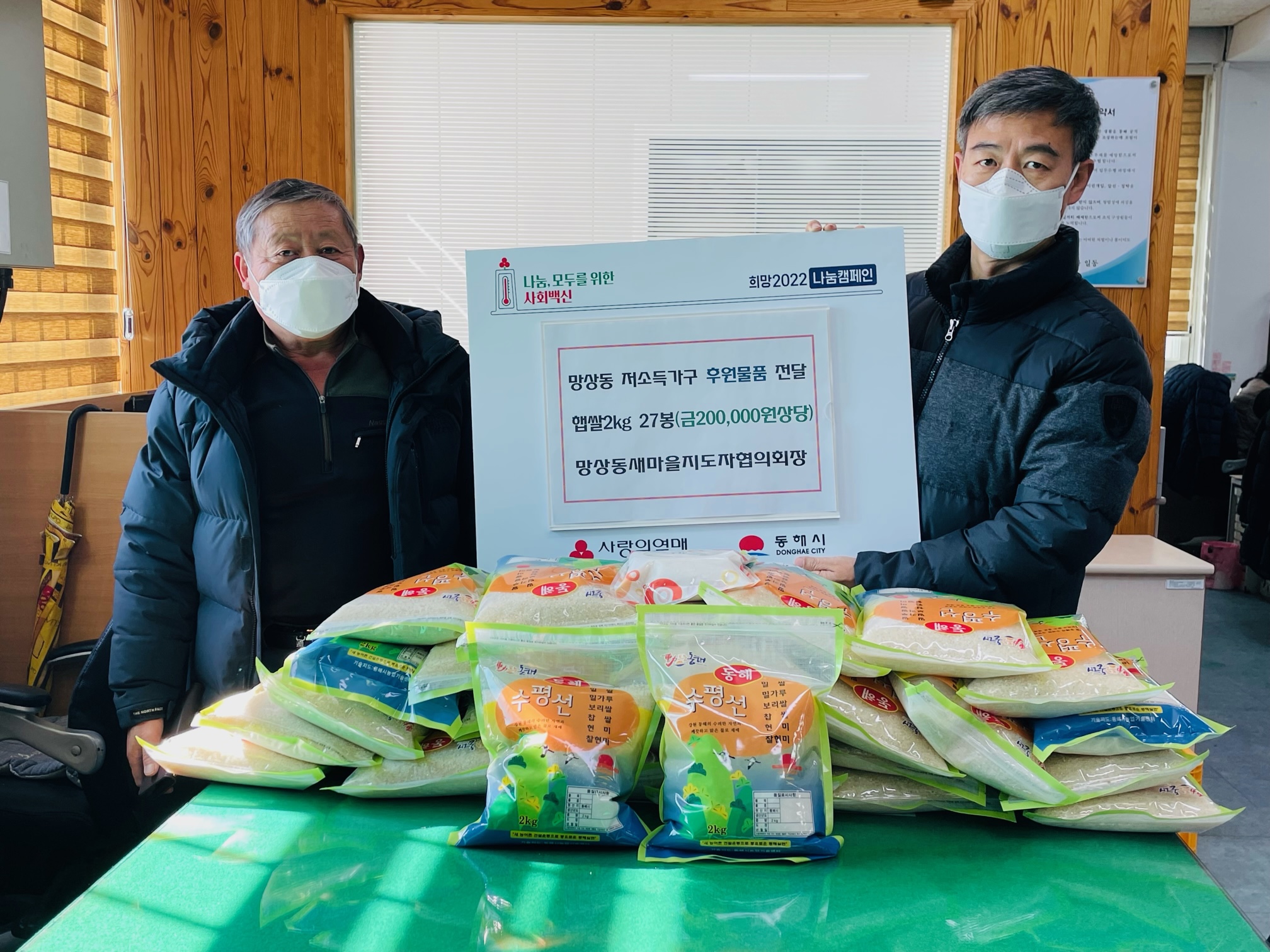 [강원사회복지신문 김종한 기자]=망상동새마을지도자협의회 김동혁 회장, 20만원 상당 햅쌀 기탁 동해시 망상동새마을지도자협의회 김동혁 회장이 망상동행정복지센터를 방문해 관내 저소득 및 복지사각지대 가구에 전달해 달라며 20만원 상당의 햅쌀2kg 27봉을 후원했다. 김동혁 회장은 "코로나 및 동절기로 생활이 어려운 ...