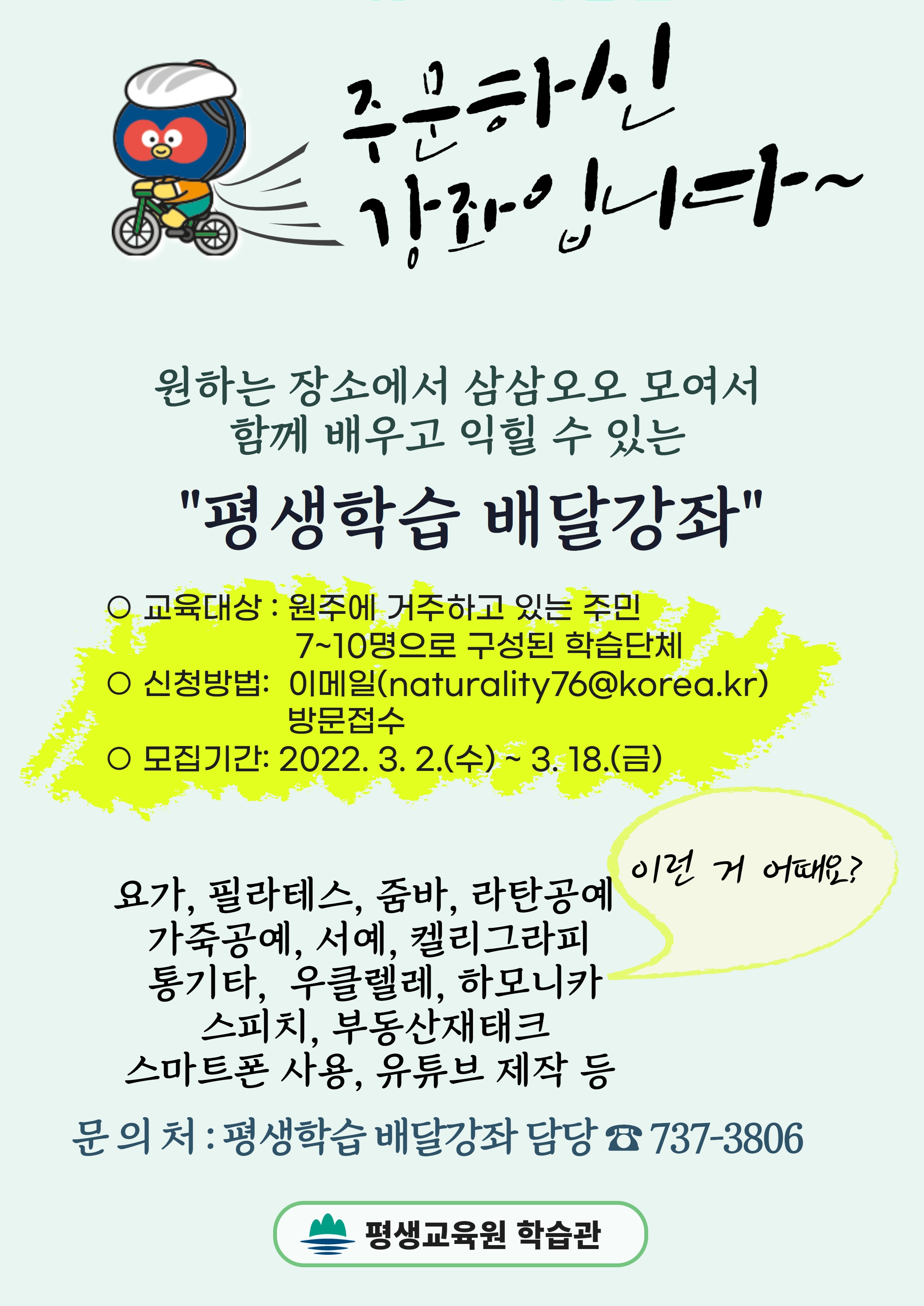 [강원사회복지신문 서은진 기자]=7~10인 이내 학습단체 구성해 원하는 장소에서 수강 요가, 통기타, 영어회화, 유튜브 제작 등 다양한 강좌 신청 원주시 학습관은 오는 3월 2일부터 평생학습 배달강좌 1기 수강생을 모집한다. 평생학습 배달강좌는 시민이 7~10인 이내 학습단체를 구성해 원하는 강좌와 장소를 신청하면 강사...