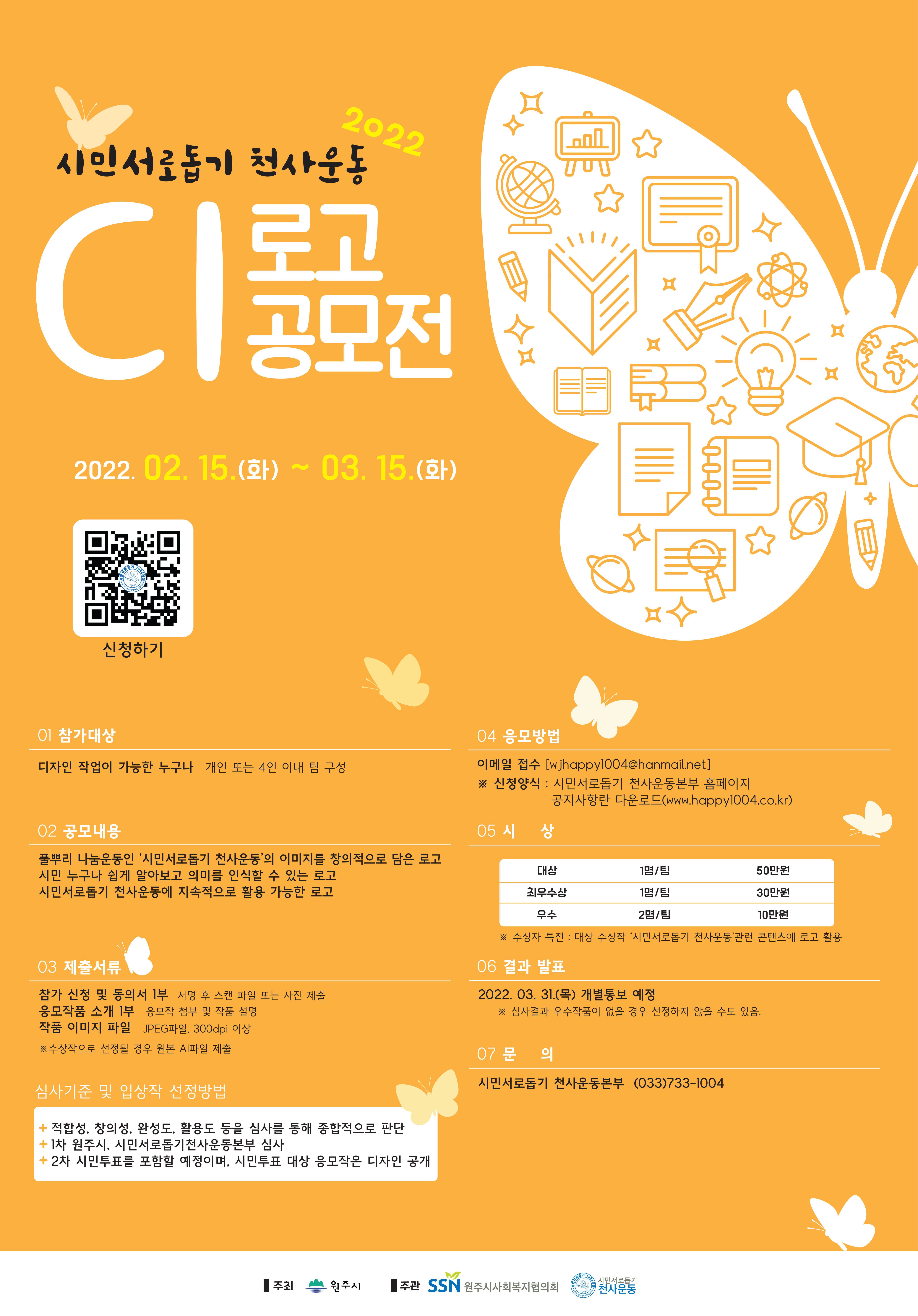 [강원사회복지신문 서은진 기자]=원주시, 원주시사회복지협의회는 시민서로돕기 천사운동 20주년을 맞이하여, 시민이 직접 만드는 '2022 시민서로돕기 천사운동 로고(CI) 공모전'을 개최한다. 이번 공모전은 풀뿌리 나눔운동인 '시민서로돕기 천사운동'이 추구하는 가치를 상징하면서 시민 누구나 쉽게 알아보고 의미를 인식...