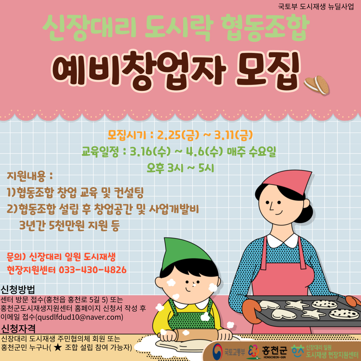 [강원사회복지신문 서은진 기자]='신장대리 도시락 협동조합' 참여자 모집 홍천군 신장대리 일원 도시재생현장지원센터(센터장 최소영)는 국토부 도시재생 뉴딜사업의 일환으로 '신장대리 도시락 협동조합 육성교육'을 진행하며 지난 2월 25일부터 오는 3월 11일까지 참여자를 모집한다고 밝혔다. 지난 2021년 소규모재생사업...