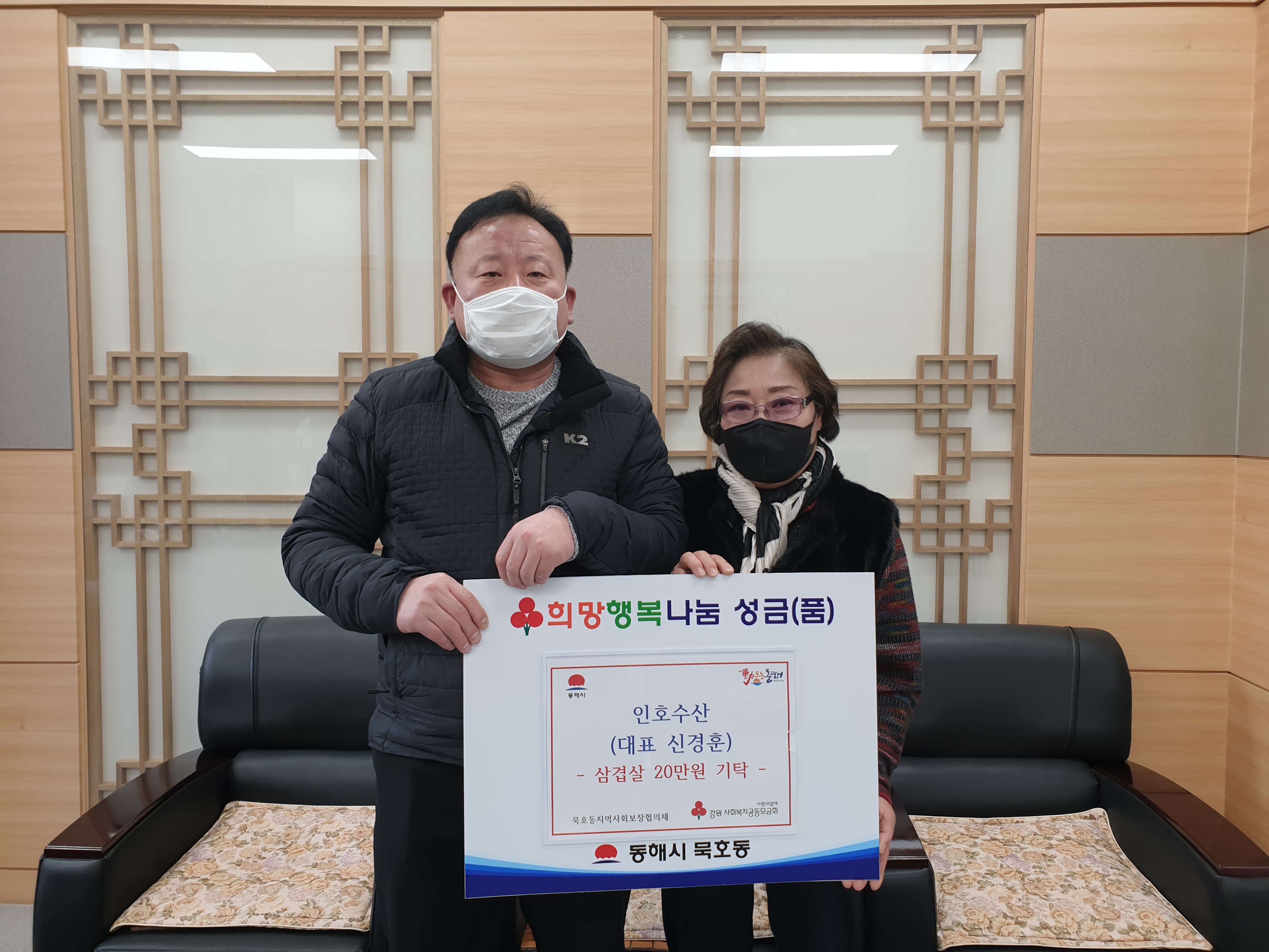 [강원사회복지신문 김종한 기자]=동해시(시장 심규언)는 묵호동에 위치한 인호수산(대표 신경훈)에서 관내 저소득 소외계층 가구에 전해달라며 20만원 상당의 삼겹살을 기탁했다고 밝혔다. 이번 기탁된 삼겹살은 묵호동행정복지센터 '희망드림냉장고'에 비치돼 코로나19 장기화 확산으로 더욱 힘들고 어려움을 겪고 있을 대상...