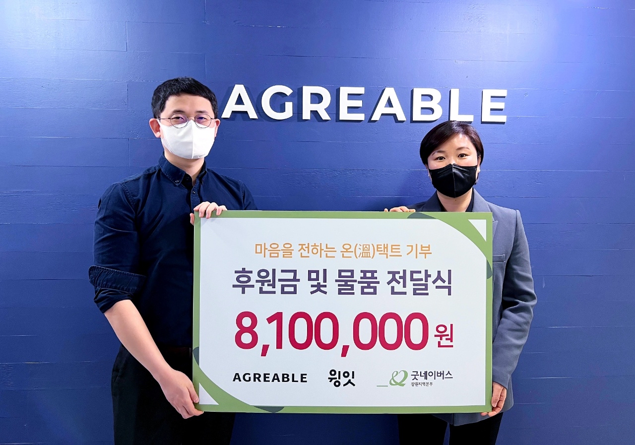 [강원사회복지신문 서은진 기자]=아그레아블(윙잇) 후원금 5백만 원과 약 3백만 원 상당의 프리미엄 양념LA갈비 120개 지원 굿네이버스 강원지역본부, 지역 내 학대피해아동 및 취약계층아동의 식사지원 위해 사용 예정 굿네이버스 강원지역본부(본부장 박미경)는 아그레아블(대표 임승진)로부터 '온(溫)택트 기부' 사업을 위...