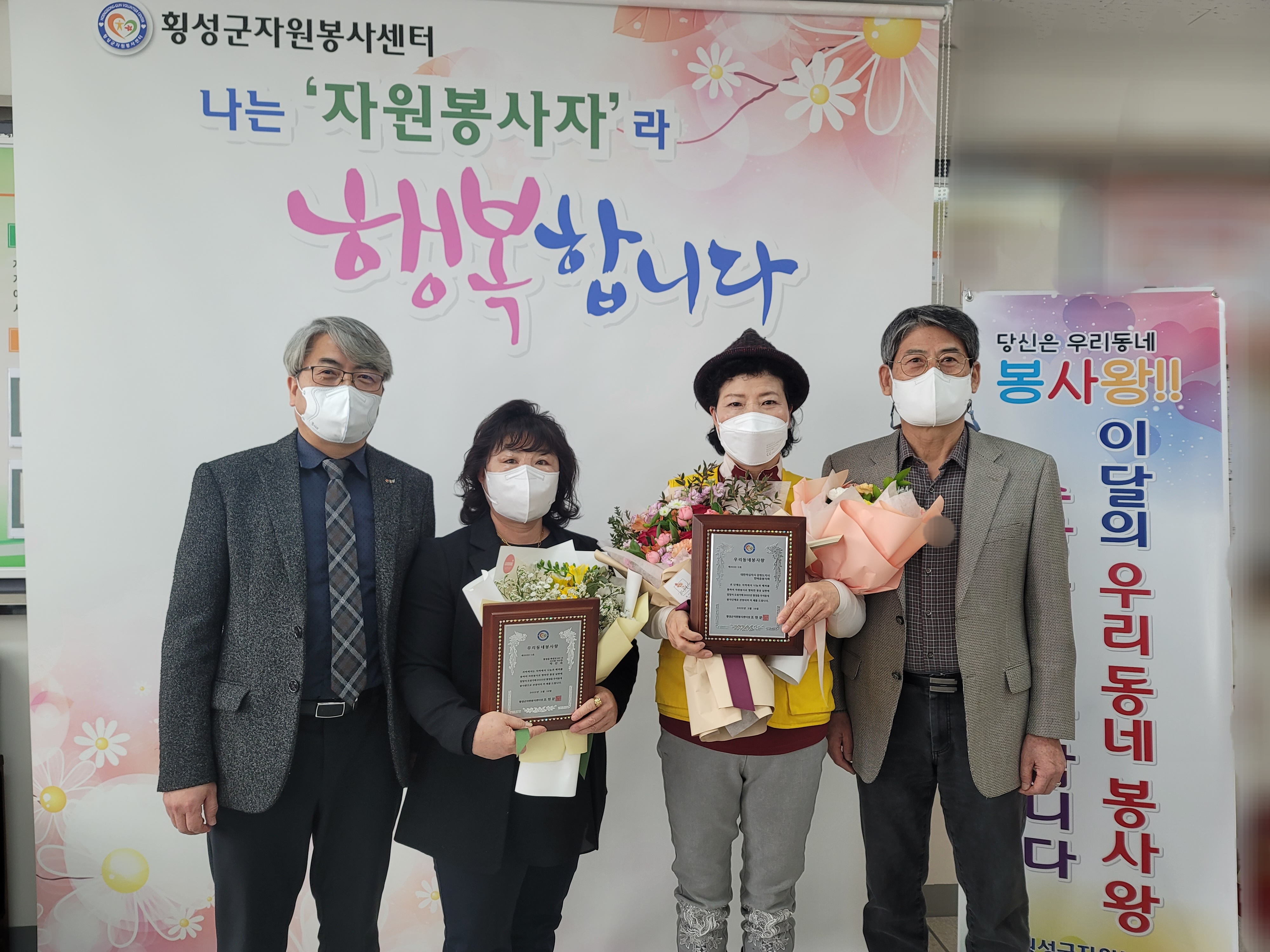 [강원사회복지신문 홍기한 기자]=횡성군자원봉사센터(센터장 조원문)는 2월 우리동네봉사왕(횡성읍)에 개인으로 박선숙 봉사자, 단체로는 대한적십자사 강원도지사 한마음봉사회를 선정하여 지난 2월 18일(금) 횡성군자원봉사센터 사무실에서 시상식을 가졌다. 개인으로 선정된 박선숙 봉사자는 '코로나19 예방접종 자원봉사...