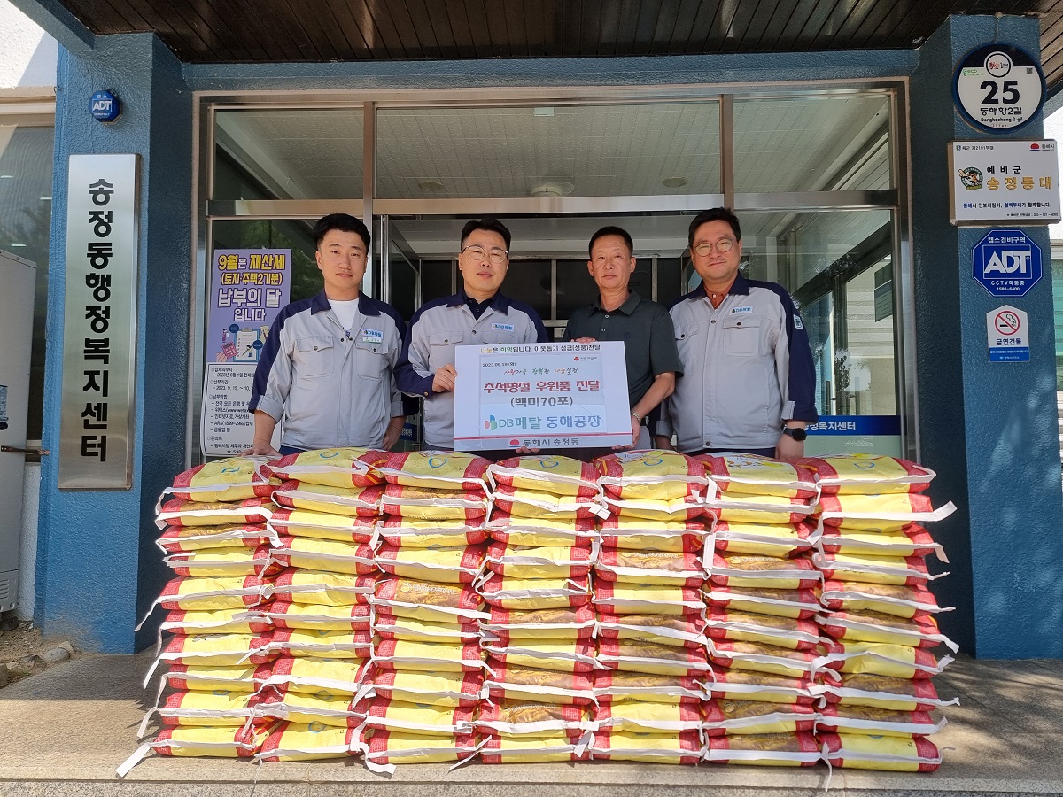 [강원사회복지신문 김종한 기자]=DB메탈 동해공장(공장장 전상수)은 추석을 맞아 지난 9월 19일 동해시 송정동에 도움이 필요한 가정에 전달해 달라며, 백미 70포를 송정동행정복지센터에 기탁하였다.