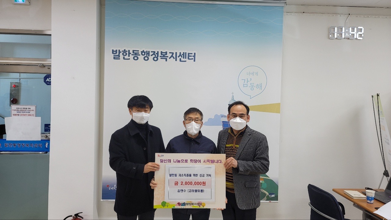[강원사회복지신문 김종한 기자]=동해 아너소사이어티 3호 회원인 고려쌀유통 김연수 대표가 지난 2월 16일 동해시 발한동 행정복지센터를 방문해 생활에 어려움을 겪고 있는 발한동 저소득층 가구를 위해 현금 200만원을 지정 기탁했다. 김연수 대표는 1억원 이상 후원한 고액기부자 모임인 아너소사이어티 회원으로 동해시...