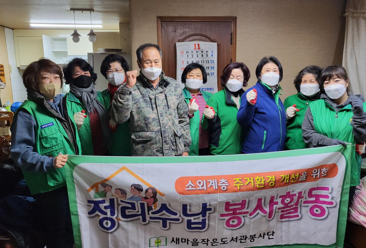 [강원사회복지신문 김종한 기자]=춘천시 교동행정복지센터(동장:김춘옥)는 지난 2월 16일 맥가이버봉사단(단장:김용균), 춘천 새마을문고(회장:이희순) 작은도서관 봉사단원과 함께 돌봄이 필요한 가정의 집안 청소와 정리, 수납 봉사 활동을 진행했다.
