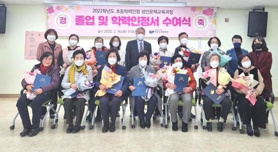 [강원사회복지신문 홍기한 기자]=원주교육문화관(관장 정기호)은 지난 2월 16일(수), '2021학년도 초등학력인정 성인문해교육 졸업식 및 학력인정서 수여식'을 개최하였다. 이번 대상자는 배움의 열정 하나로 어려운 여건 속에서 학업에 정진한 반장 한치순 학생을 비롯한 11명으로, 2020년 초등학력 성인문해교육 2단계 과정...