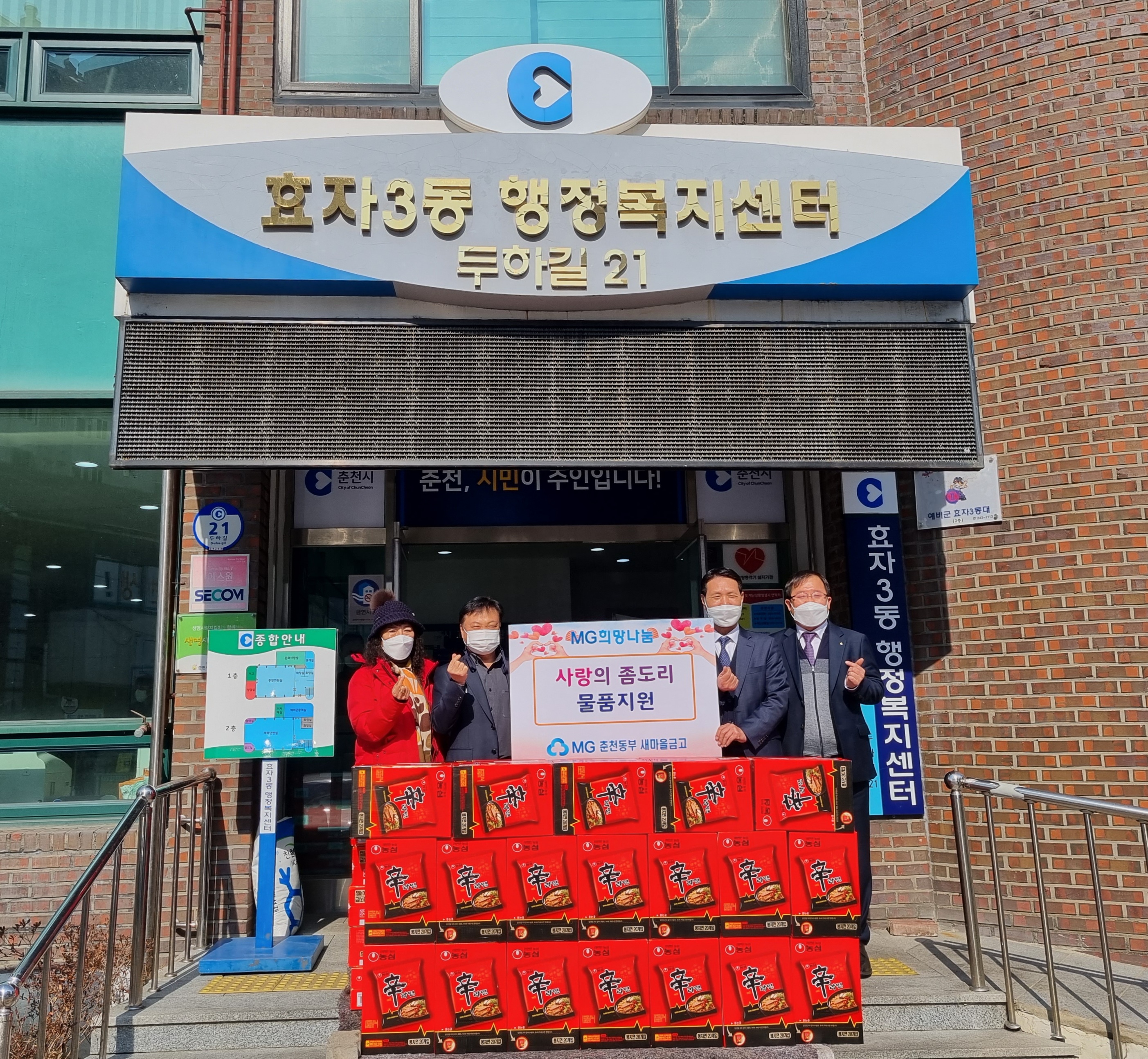 [강원사회복지신문 홍기한 기자]=춘천동부새마을금고(이사장:박광선)는 지난 2월 15일 춘천시 효자3동 행정복지센터를 방문하여 '사랑의 좀도리운동'으로 임직원의 정성을 모은 라면 68박스(93만원 상당)를 전달했다.