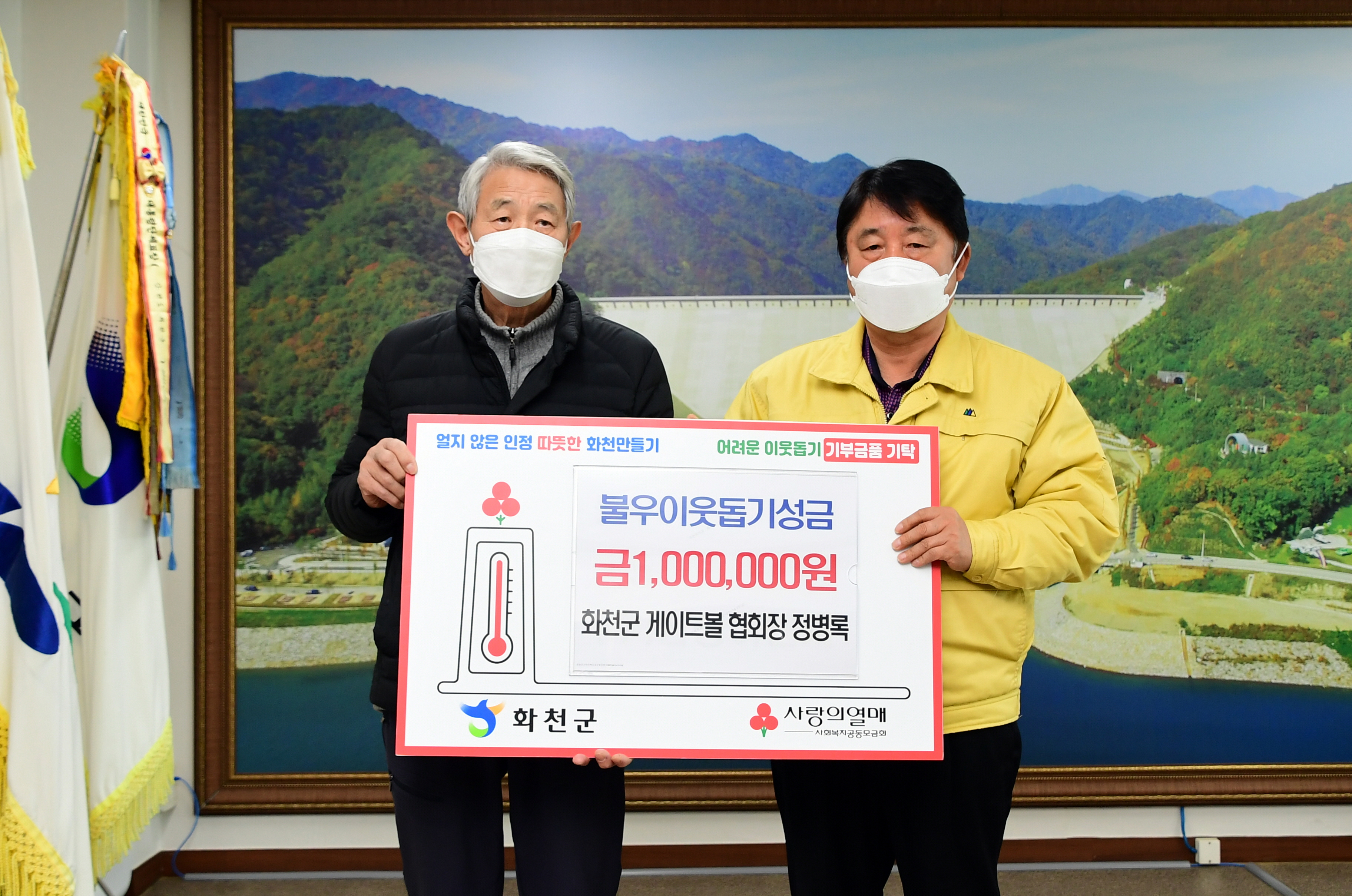 [강원사회복지신문 이정환 기자]=정병록 화천군 게이트볼 협회장은 지난 2월 15일 최문순 화천군수를 방문해 이웃돕기 성금 100만원을 기탁했다.