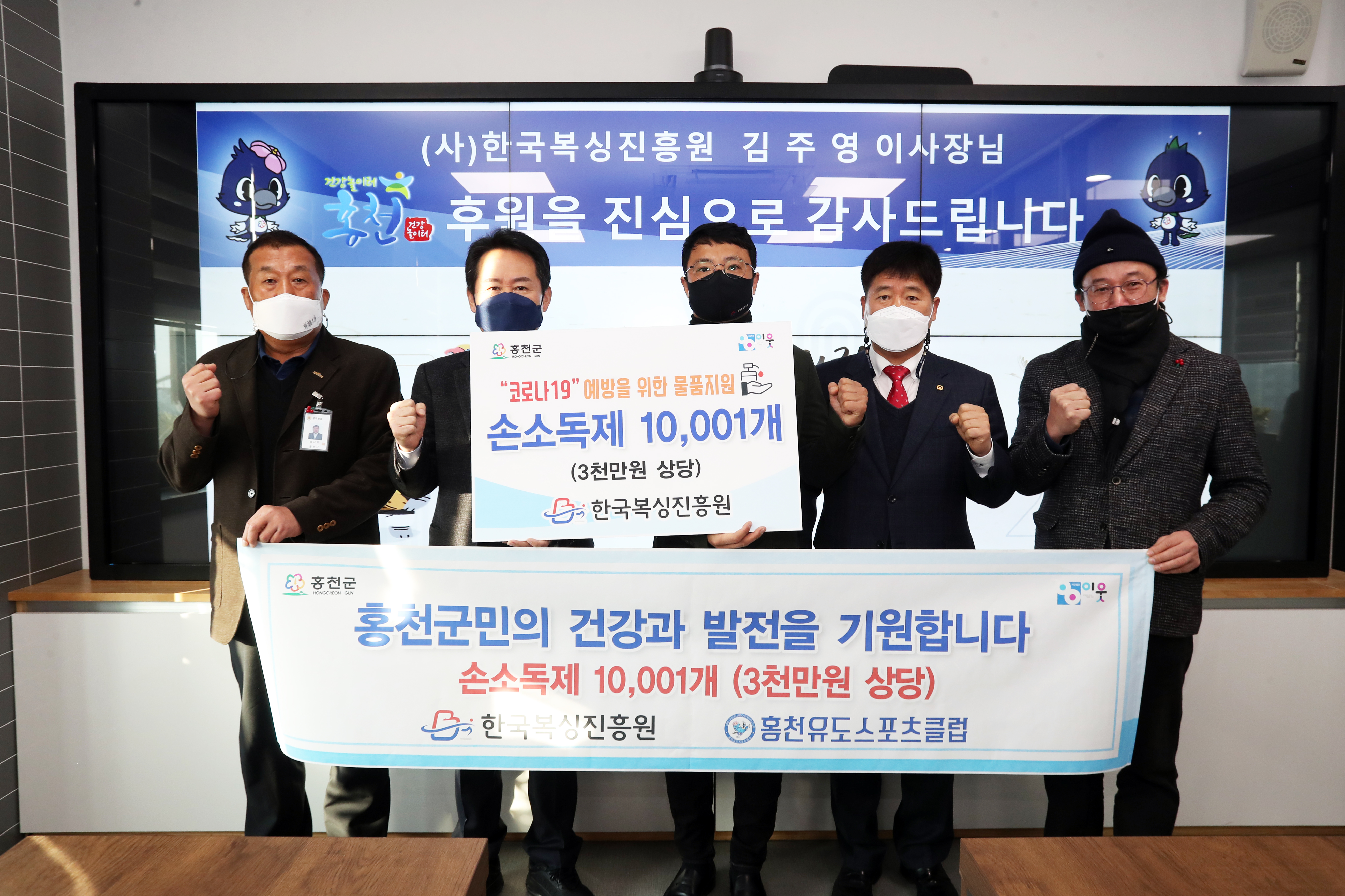 [강원사회복지신문 서은진 기자]=(사)한국복싱진흥원 김주영 이사장은 지난 2월 10일 (사)이웃 박학천 이사장과 함께 홍천군청을 방문, 3,000만원 상당의 손소독제 1만 1개를 기탁했다. 홍천군과 (사)이웃은 기탁 받은 손소독제를 홍천군 우호도시인 필리핀 산후안시의 계절근로자 등과 홍천의 복지사각지대 소외계층 및 한부...