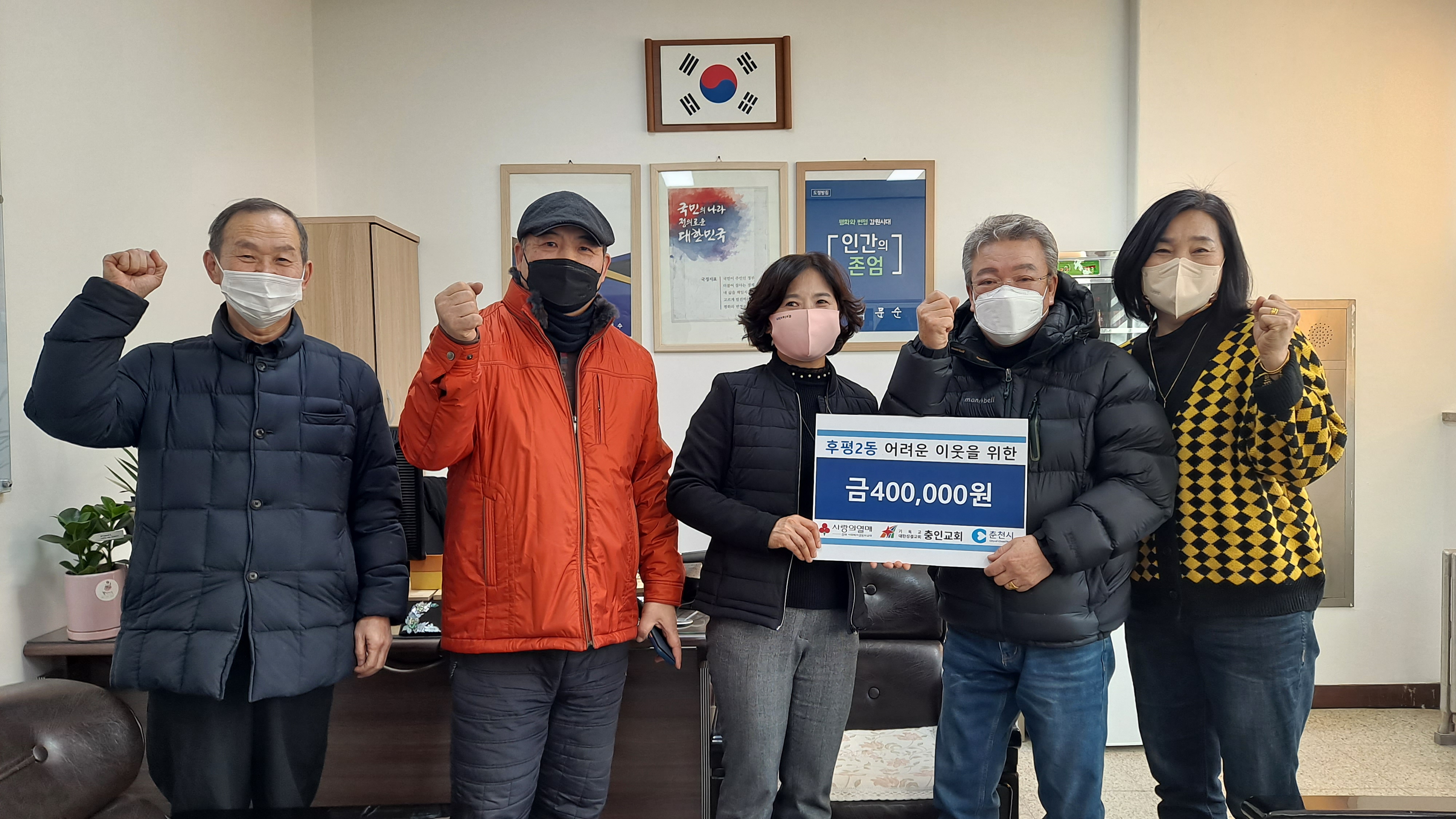 [강원사회복지신문 홍기한 기자]=대한성결교회 충인교회(담임목사:이종규)는 지난 2월 9일 춘천시 후평2동 행정복지센터를 방문해 관내 어려운 이웃을 위한 후원금 40만원을 전달했다.