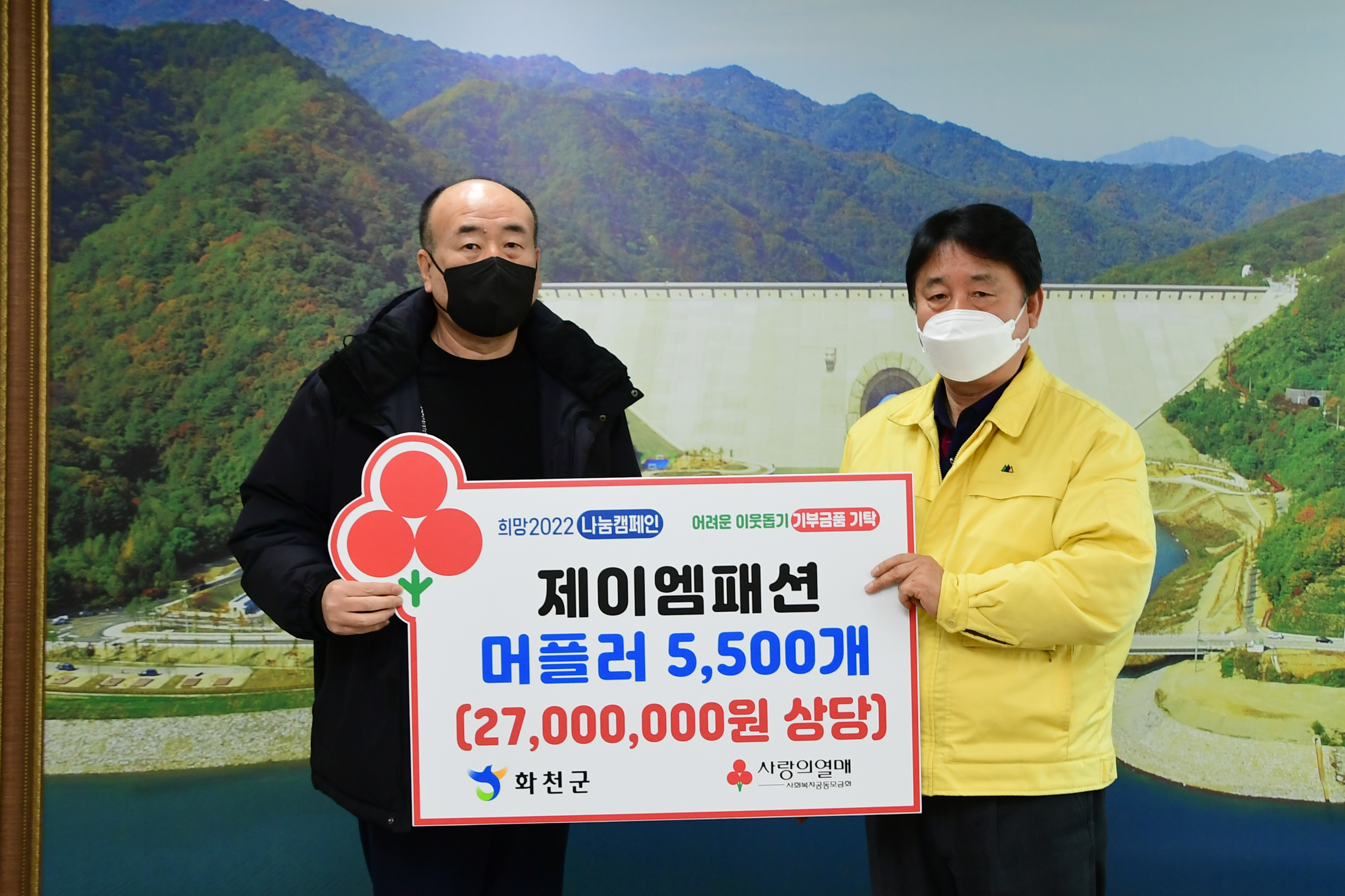 [강원사회복지신문 이정환 기자]=제이엠 패션(대표:이병재)은 지난 2월 8일 최문순 화천군수를 방문해 어려운 이웃을 위해 써달라며 2,700만원 상당의 머플러 5,500개를 기탁했다.