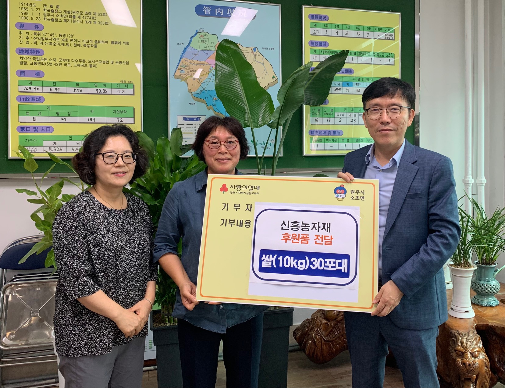[강원사회복지신문 서은진 기자]=원주시 소초면 신흥농자재(대표 장미영)는 지난 9월 19일 관내 저소득층을 위하여 원주쌀 행복담은쌀(백미) 10kg 30포(90만 원 상당)를 기부하였다.