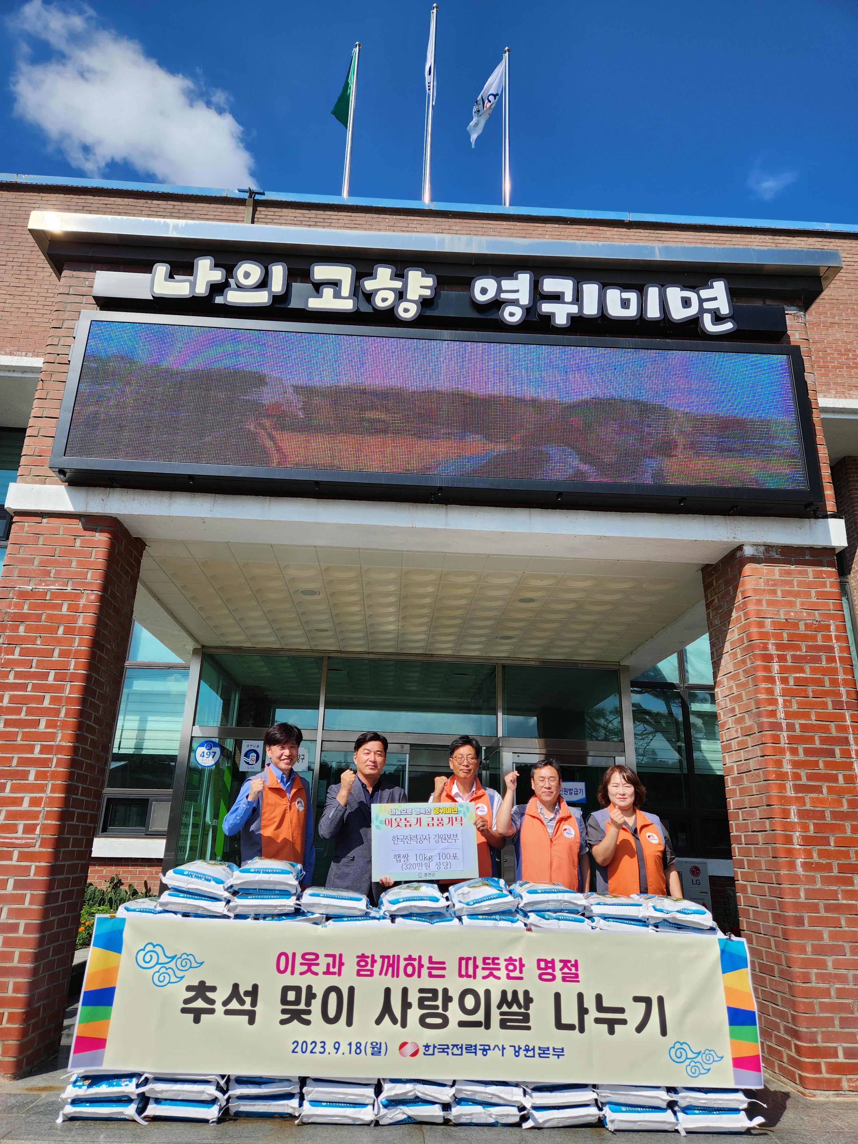 [강원사회복지신문 홍기한 기자]=한국전력공사 강원본부(본부장 황인목)는 지난 9월 18일 홍천군 영귀미면행정복지센터를 방문하여 홍천산 햅쌀 10kg 100포(320만원 상담)를 기탁했다. 홍천군 영귀미면 내 저소득 취약계층을 위해 준비된 이번 기탁은 '강원 지역 농가를 돕는 농·특산물 팔아주기 운동'의 일환이며, 총 100가...