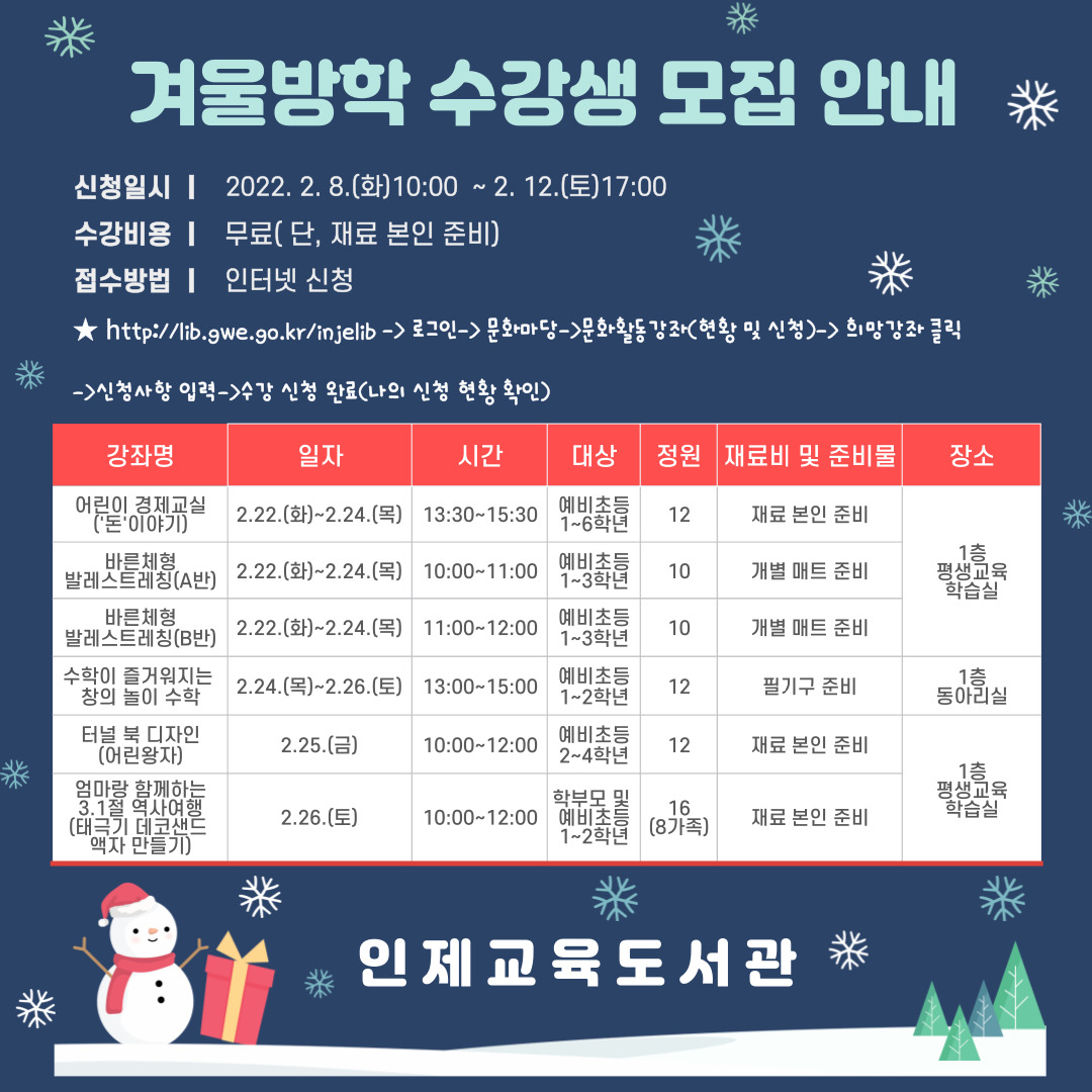 [강원사회복지신문 이정환 기자]=인제교육도서관(관장 최복진)은 오는 2월 22일(화)~2월 26일(토)까지 초등학생들에게 자발적인 학습 참여를 통한 동기부여를 위해 겨울방학 프로그램을 운영한다. 이번 방학 특강은 △터널 북 디자인 '어린 왕자' △어린이 경제 교실 '돈 이야기' △바른 체형 발레 스트레칭 △수학이 즐거워...