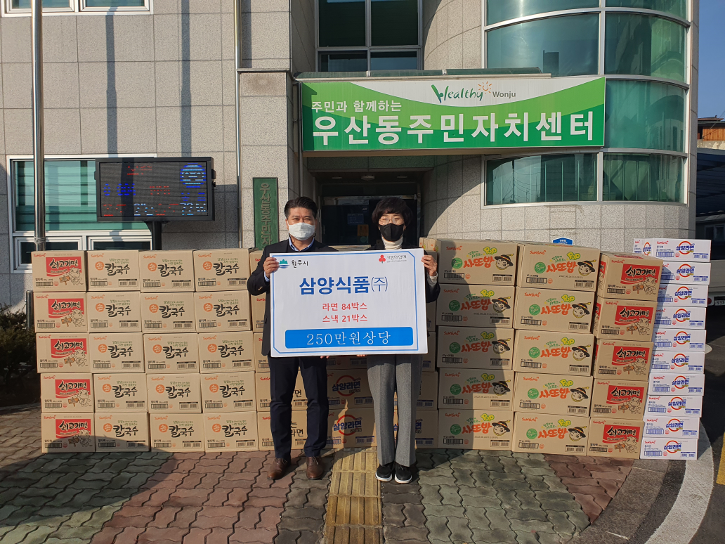 [강원사회복지신문 서은진 기자]=삼양식품(주) 원주공장(본부장 김동찬)은 지난 1월 27일 설 명절을 맞아 우산동 행정복지센터를 방문해 250만 원 상당의 라면과 스낵 105박스를 전달했다. 후원품은 우산동 경로당 15개소에 전달될 예정이다. 김동찬 본부장은 "명절을 맞아 지역 어르신을 공경하는 마음으로 후원하게 됐다."...