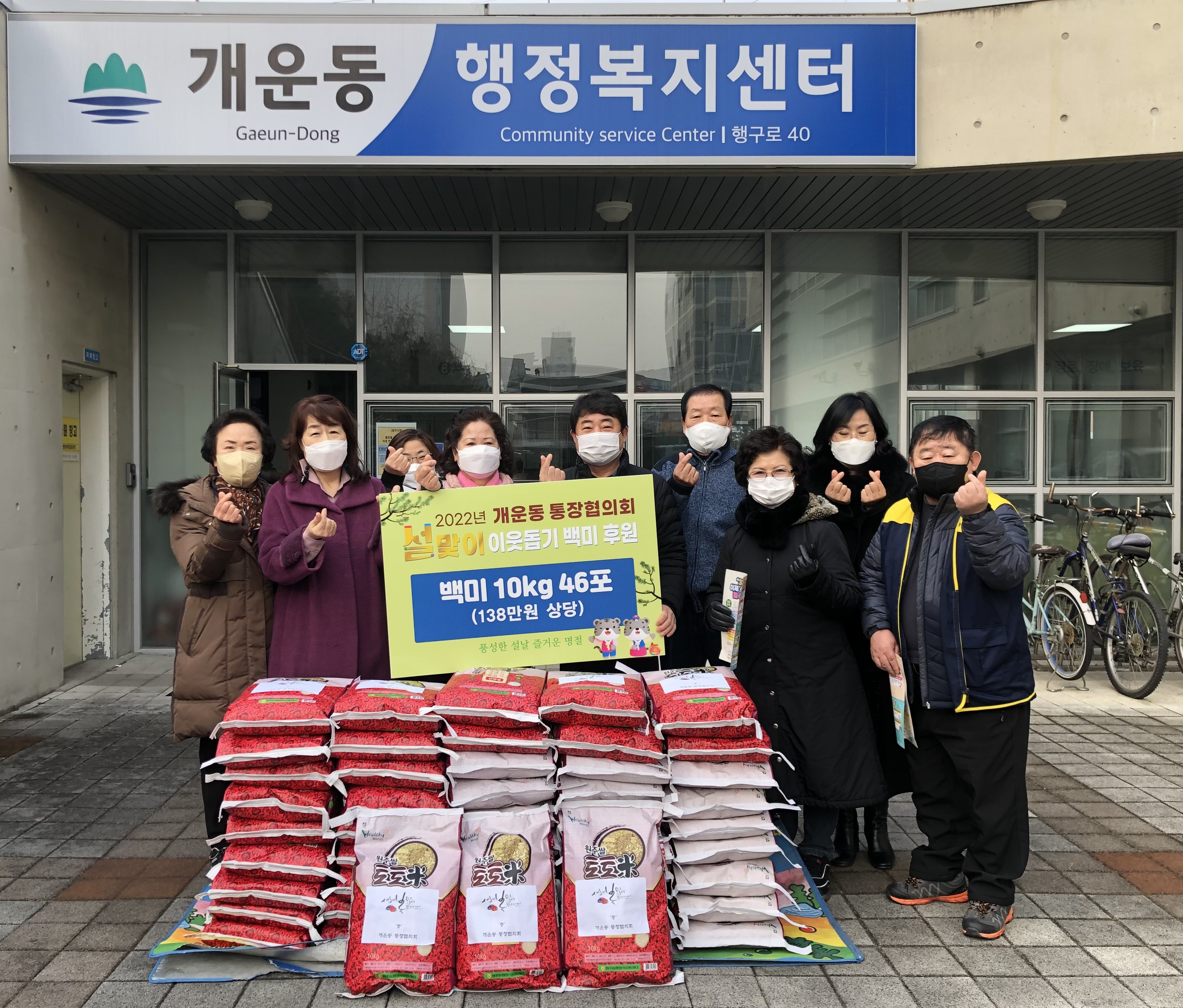 [강원사회복지신문 홍기한 기자]=원주시 개운동통장협의회는 지난 1월 26일 개운동 행정복지센터를 방문해 '이웃과 나누는 행복한 설맞이' 138만 원 상당의 백미(10kg) 46포를 전달했다. 개운동통장협의회는 작년 3월부터 코로나19 예방과 안전한 개운동을 위해 적극적인 마을방역관 활동을 펼쳐 우수마을방역단 최우수상을 ...