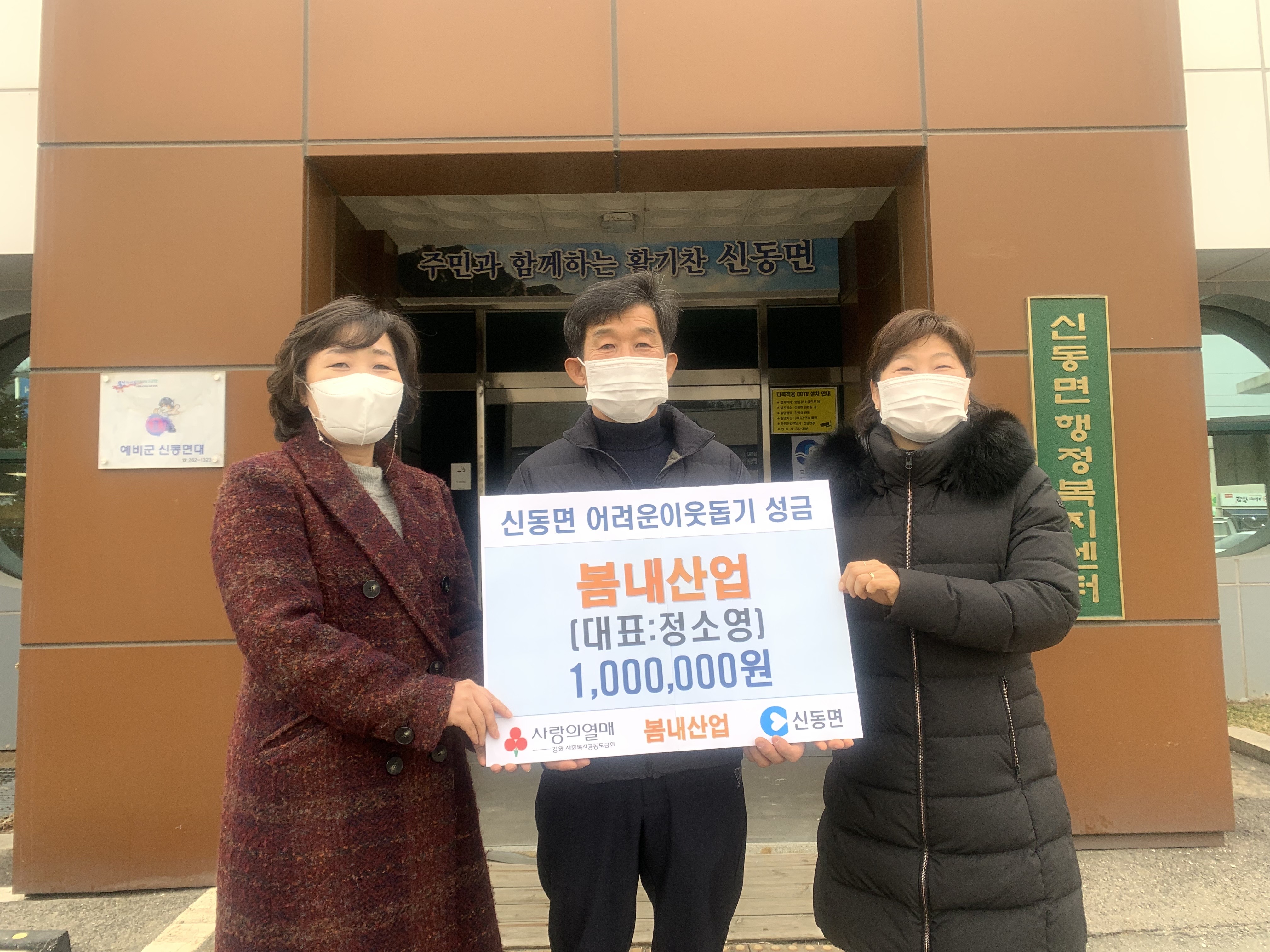 [강원사회복지신문 서은진 기자]=봄내산업(대표 정소영)은 지난 1월 19일 춘천시 신동면에 거주하는 어려운 이웃을 돕기 위해 100만원의 후원금을 전달했다.