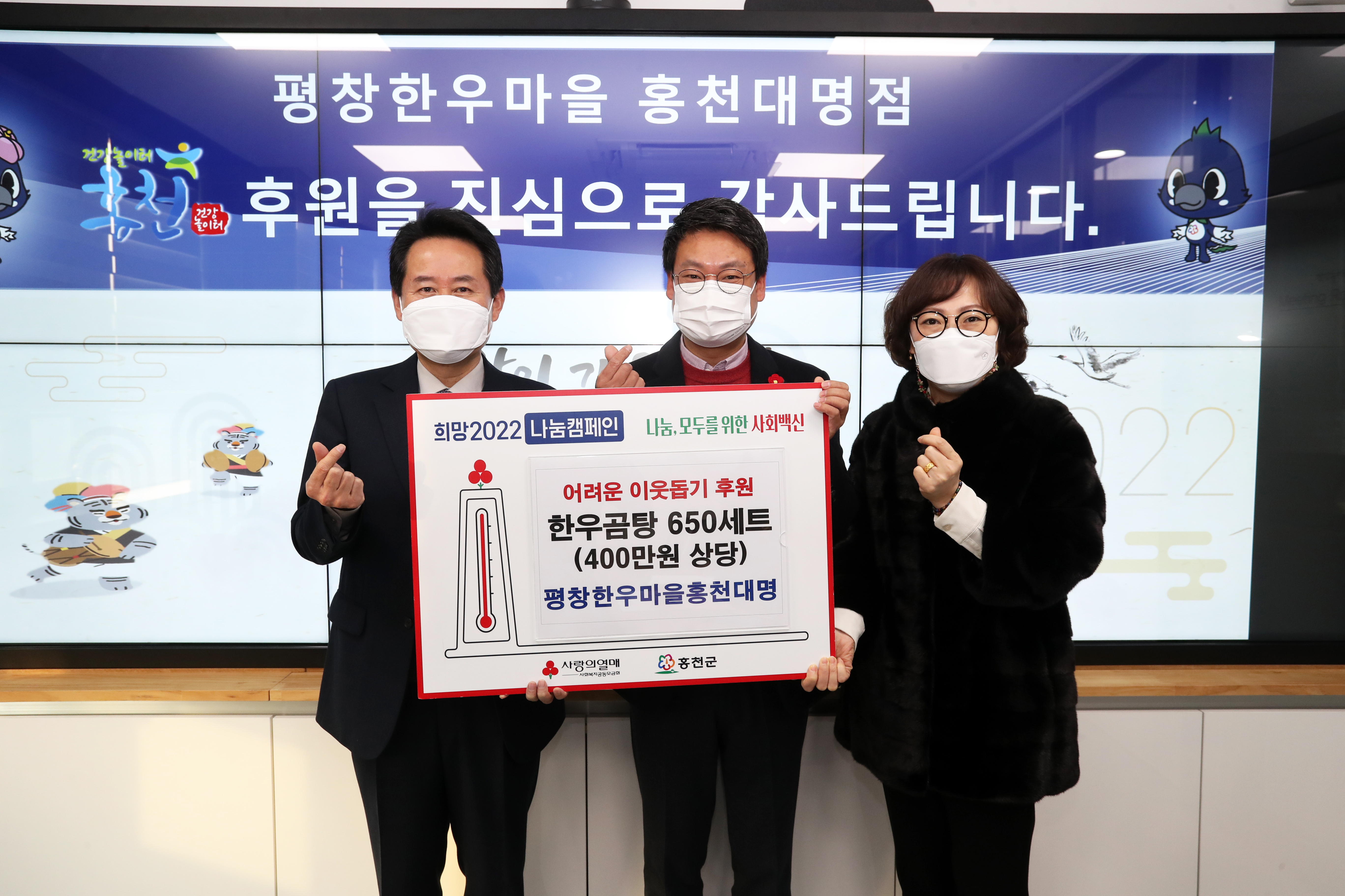[강원사회복지신문 이정환 기자]=평창한우마을(사장 황정기)은 지난 1월 19일 홍천군청을 방문, 400만원 상당의 한우곰탕 650세트를 전달했다.