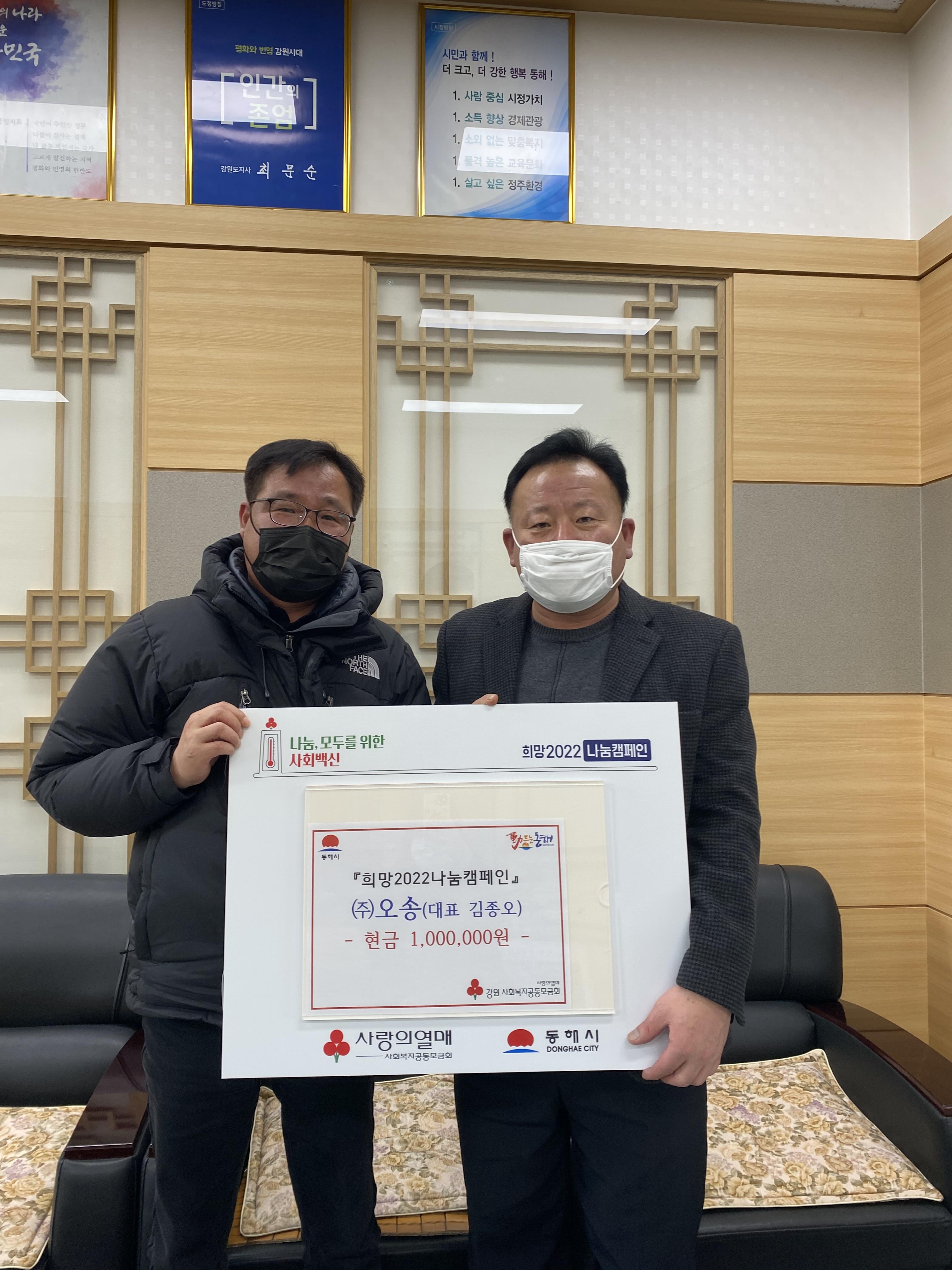 [강원사회복지신문 김종한 기자]=(주)오송(대표 김종오)에서 동해시 묵호동행정복지센터를 방문해 생활이 어려운 분들을 위해 사용해 달라며, 현금 100만원을 기탁했다.