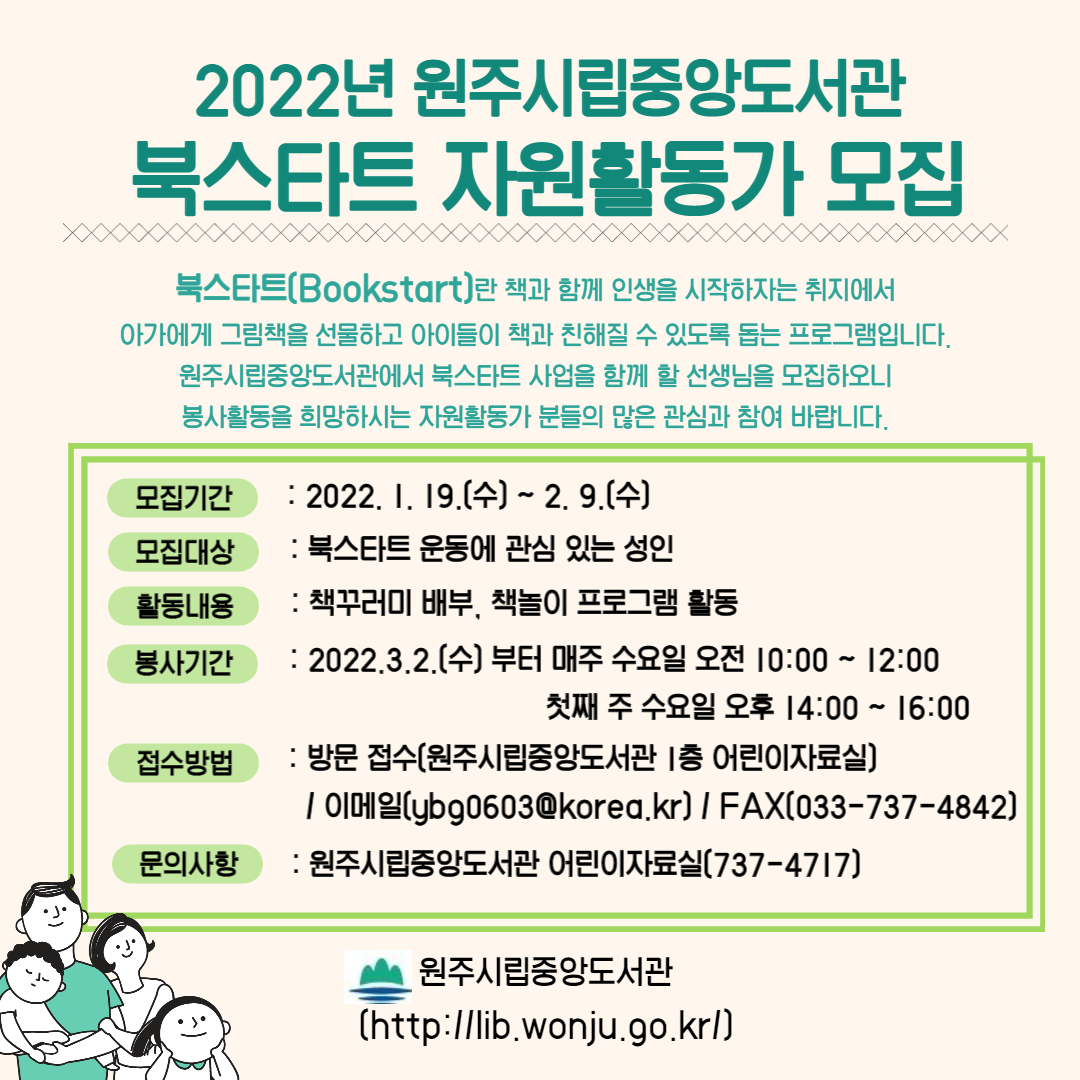 [강원사회복지신문 서은진 기자]=원주시립중앙도서관은 지난 1월 19일부터 2022년 북스타트 프로그램 자원활동가를 모집한다. 북스타트 프로그램은 '책과 함께 인생을 시작하자.'라는 취지로 영유아에게 그림책이 든 가방을 선물하고 책과 친해질 수 있도록 하는 사회적 육아 독서 지원 운동이다. 3월부터 진행되는 이 프로그...