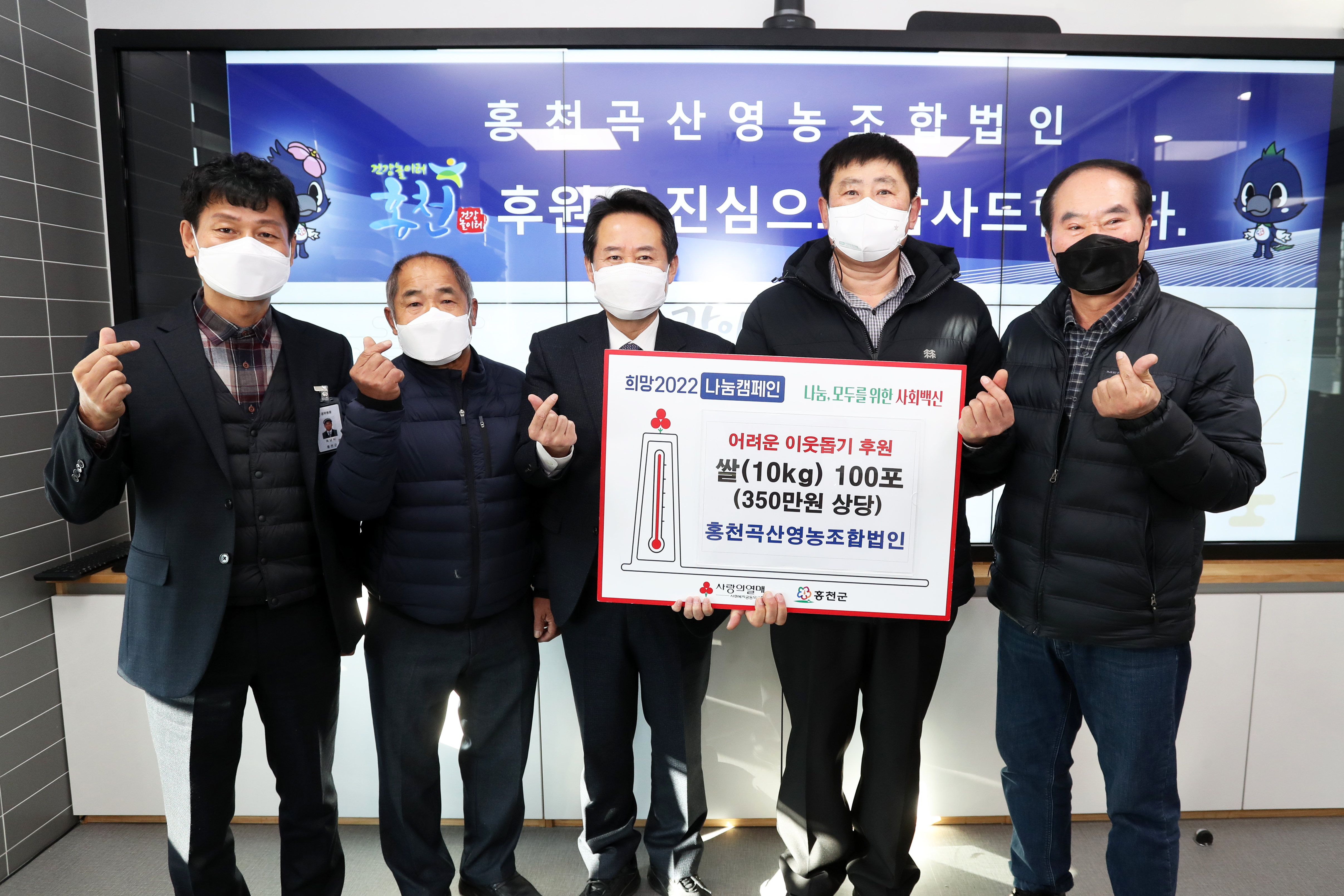 [강원사회복지신문 서은진 기자]=홍천 곡산영농조합법인(대표 윤태건)은 지난 1월 17일 홍천군청을 방문, '희망 2022 나눔 캠페인'에 350만원 상당의 쌀 100포(1포 10kg)를 기탁했다. 기탁된 쌀은 생활에 어려움을 겪고 있는 관내 저소득층 및 홀몸 어르신 가구에 전달될 예정이다.