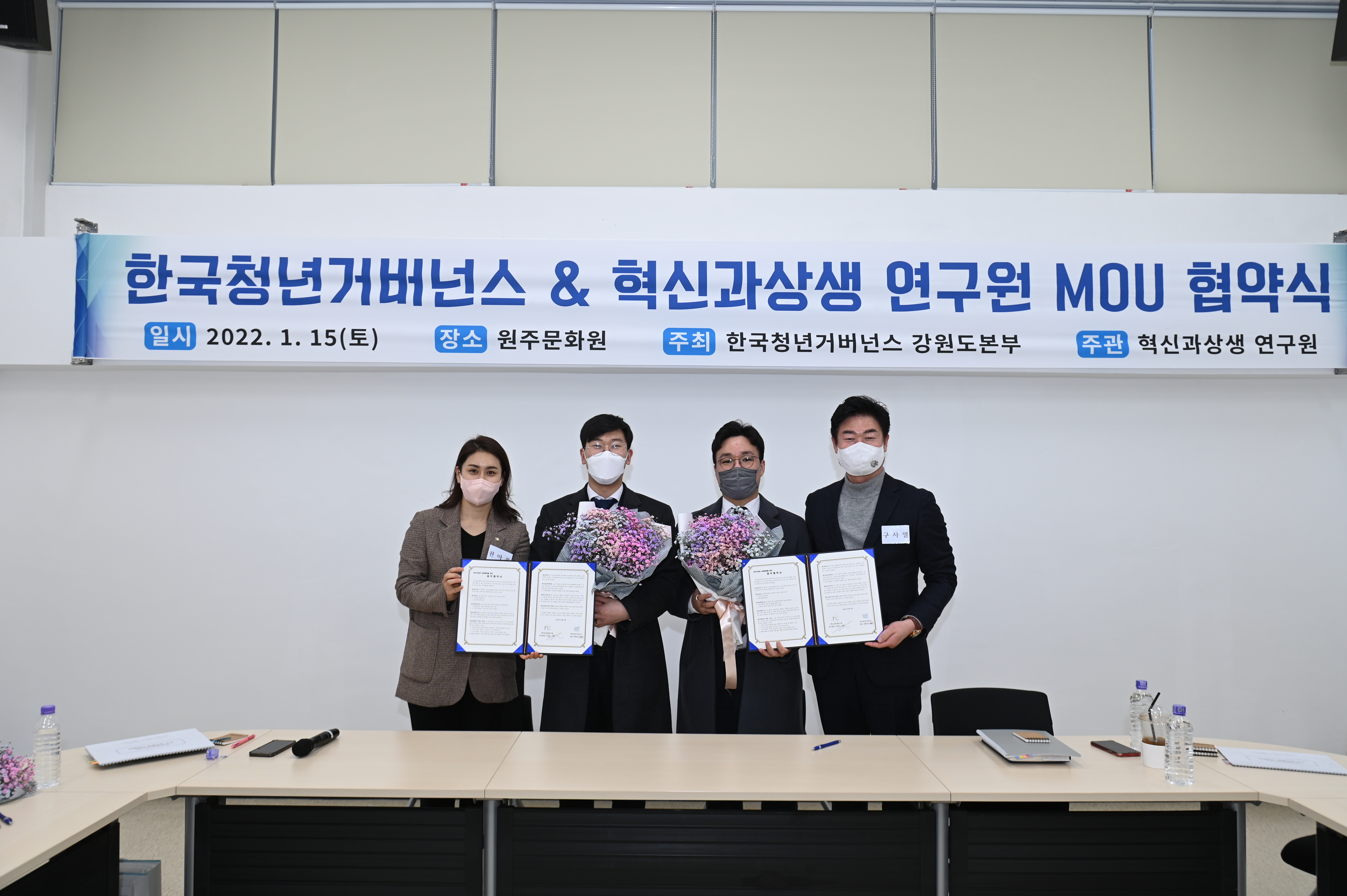 [강원사회복지신문 홍기한 기자]=지난 1월 15일 토요일 15시부터 17시까지 원주문화원에서 한국청년거버넌스 주최, 원주 혁신과상생연구원 주관, '전국 청년 활동 우수사례 공유'를 주제로 발제를 듣고 자유토론 시간을 가진 후, 업무협약식을 진행하였다. 구자열 혁신과 상생연구원 이사장은 "지역별 청년 활동 우수사례의 ...