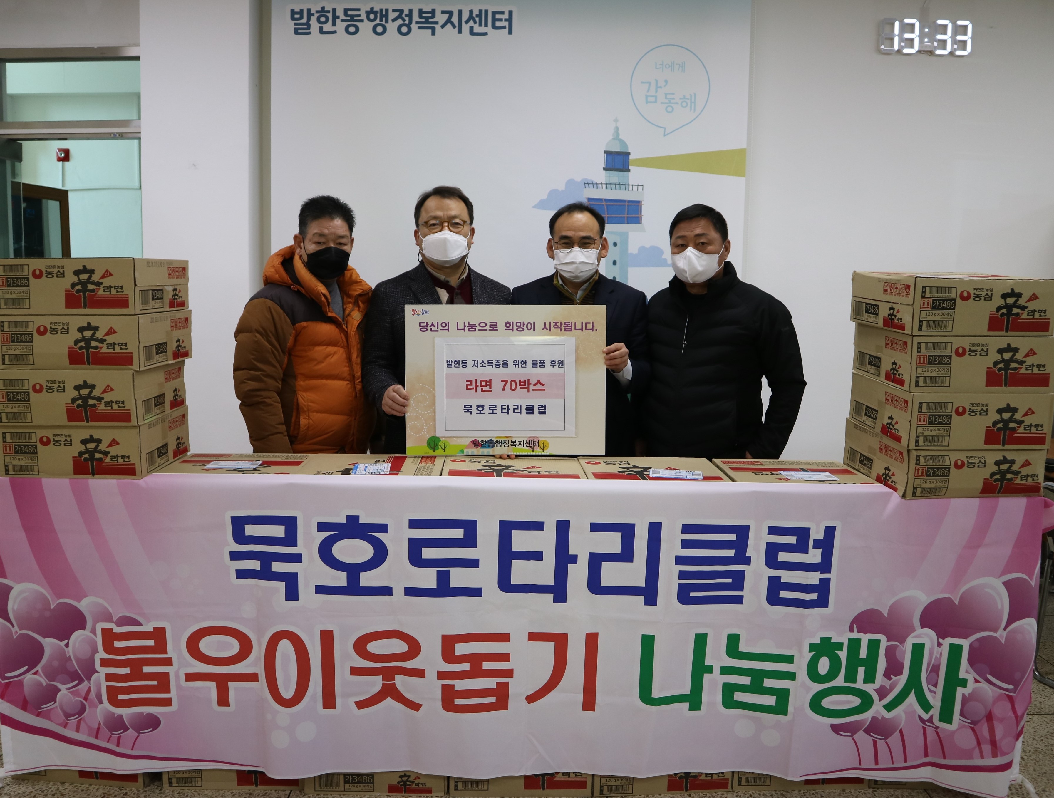 [강원사회복지신문 이정환 기자]=묵호로타리클럽(회장 조형래)에서 지난 1월 12일 동해시 발한동행정복지센터를 방문해 관내 저소득층을 위해 사용해 달라며 라면 70박스(160만원 상당)를 후원했다. 조형래 회장은 "코로나19와 한파로 모두가 힘든 시기 이웃의 정이 그리운 요즘, 우리의 후원이 부디 어려운 이웃에게 작은 힘...