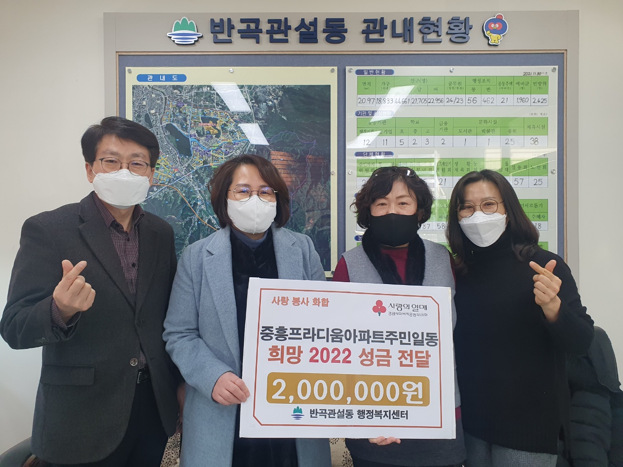 [강원사회복지신문 서은진 기자]=원주시 반곡관설동 중흥프라디움아파트 주민 일동(통장 홍정표, 최영인)은 지난 1월 12일 반곡관설동 행정복지센터를 방문해 이웃돕기 성금 200만 원을 전달했다. 후원금은 독거노인과 저소득층 가구의 겨울철 난방 등을 위해 쓰일 예정이다. 아파트 주민들은 주변의 소외된 이웃을 돕기 위해...