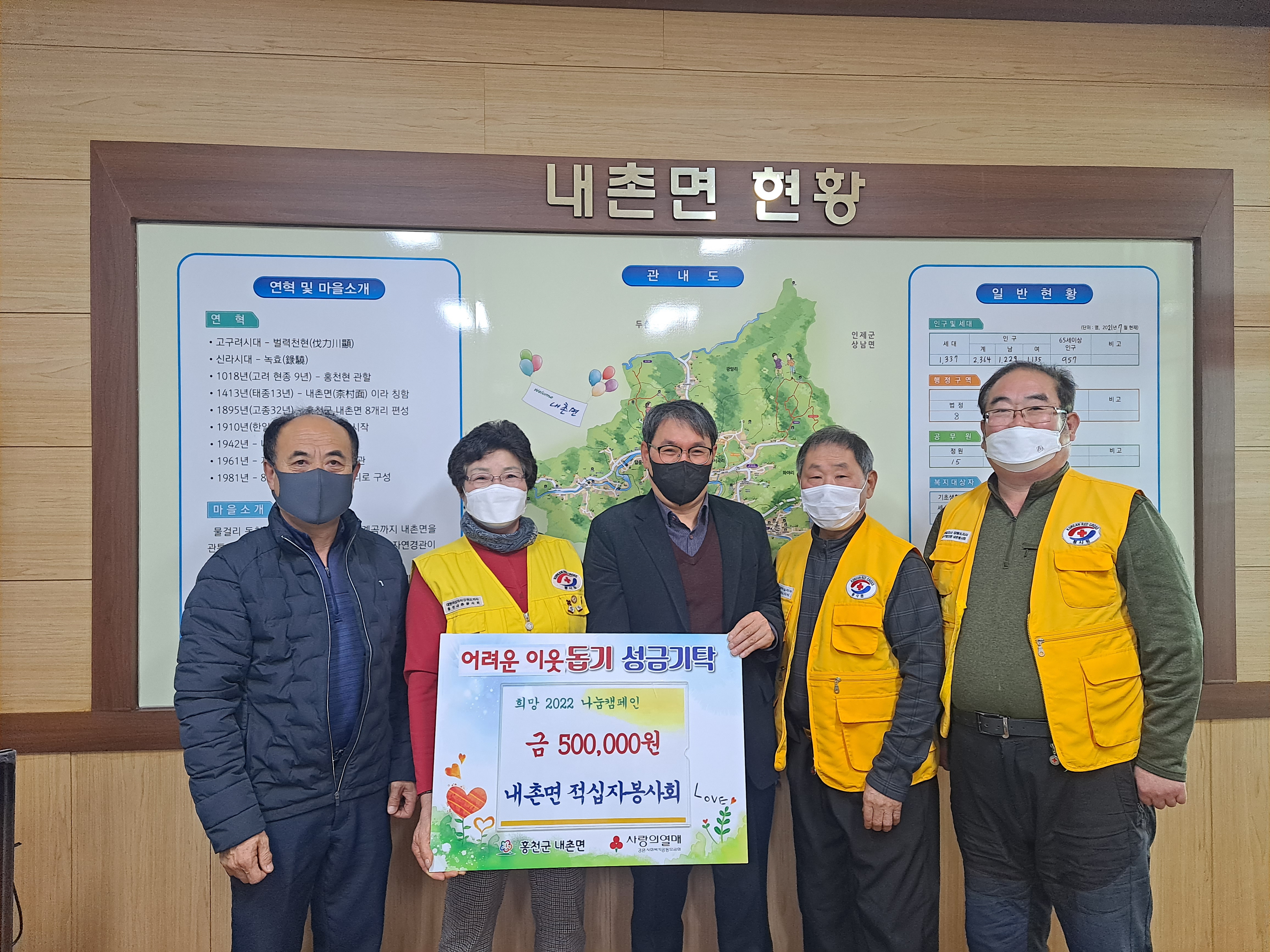 [강원사회복지신문 홍기한 기자]=홍천군 내촌면 적십자봉사회(회장 김선옥)는 지난 1월 12일 내촌면 행정복지센터를 방문, 어려운 이웃돕기 성금 50만원을 기탁했다. 김선옥 회장은 "코로나19로 어려움이 많은 시기에 소외받는 이웃에게 조금이라도 힘이 될 수 있는 곳에 사용됐으면 한다"고 말했다. 정윤선 내촌면장은 "귀중...