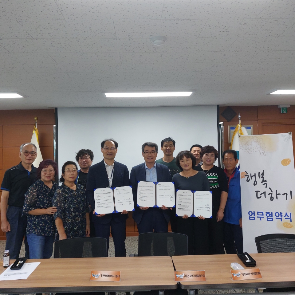 [강원사회복지신문 최재석 기자]=원주시 우산동지역사회보장협의체(위원장 최인환)는 지난 9월 13일 우산동행정복지센터에서 (사)전국독서새물결모임에서 운영하고 있는 교육문화공간 행복마실(대표 임영규)과 지역사회 복지교육 후원 협약식을 진행했다. 이번 협약으로 행복마실은 교육장소 후원과 더불어 그림교실, 독서교...
