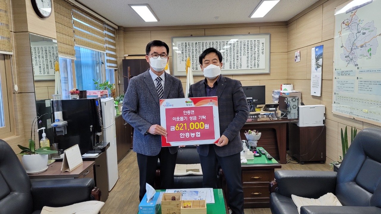 [강원사회복지신문 홍기한 기자]=안흥농협(조합장 남홍순)은 지난 12월 31일 횡성군 안흥면행정복지센터를 방문하여 '사랑의 이웃돕기 성금' 62만 1천원을 기탁했다. 남홍순 조합장은 "지난 2년 동안 안흥농협을 찾아주신 고객들의 작지만 따스한 손길이 모여 뜻깊은 성금을 기탁할 수 있게 됐다."고 전했다. 양명모 안흥면장...