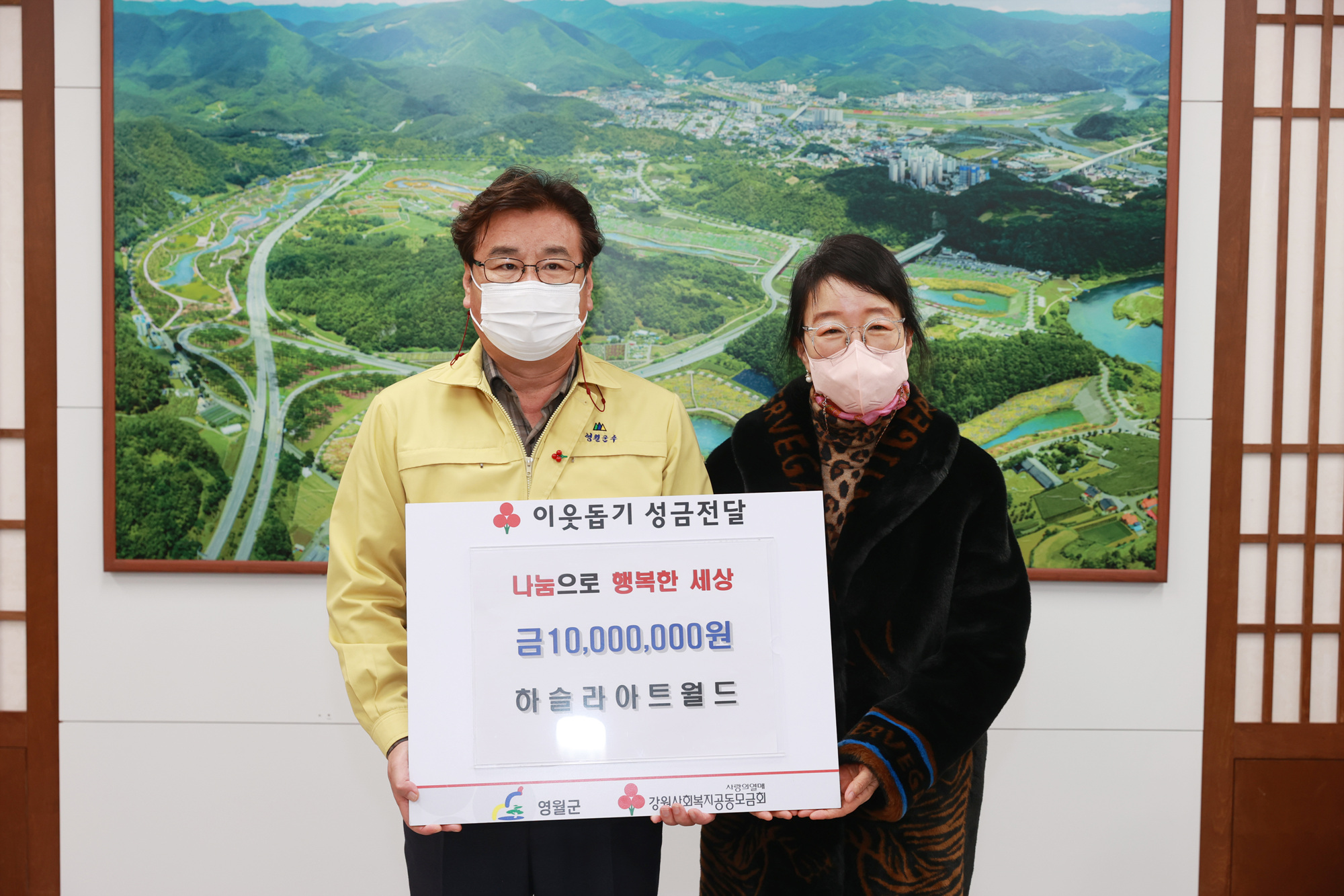[강원사회복지신문 홍기한 기자]=하슬라 아트월드(대표 박신정)에서는 지난 12월 30일 영월군 주천면 저소득층 지원을 위한 성금 1천만원을 영월군에 기탁하였다. 기탁자는 "코로나19 위기와 경기침체로 불우한 이웃들을 위해 올해도 성금전달을 이어가게 됐다. 앞으로도 지역사회에 보탬이 되는 나눔을 실천할 계획이다."라...