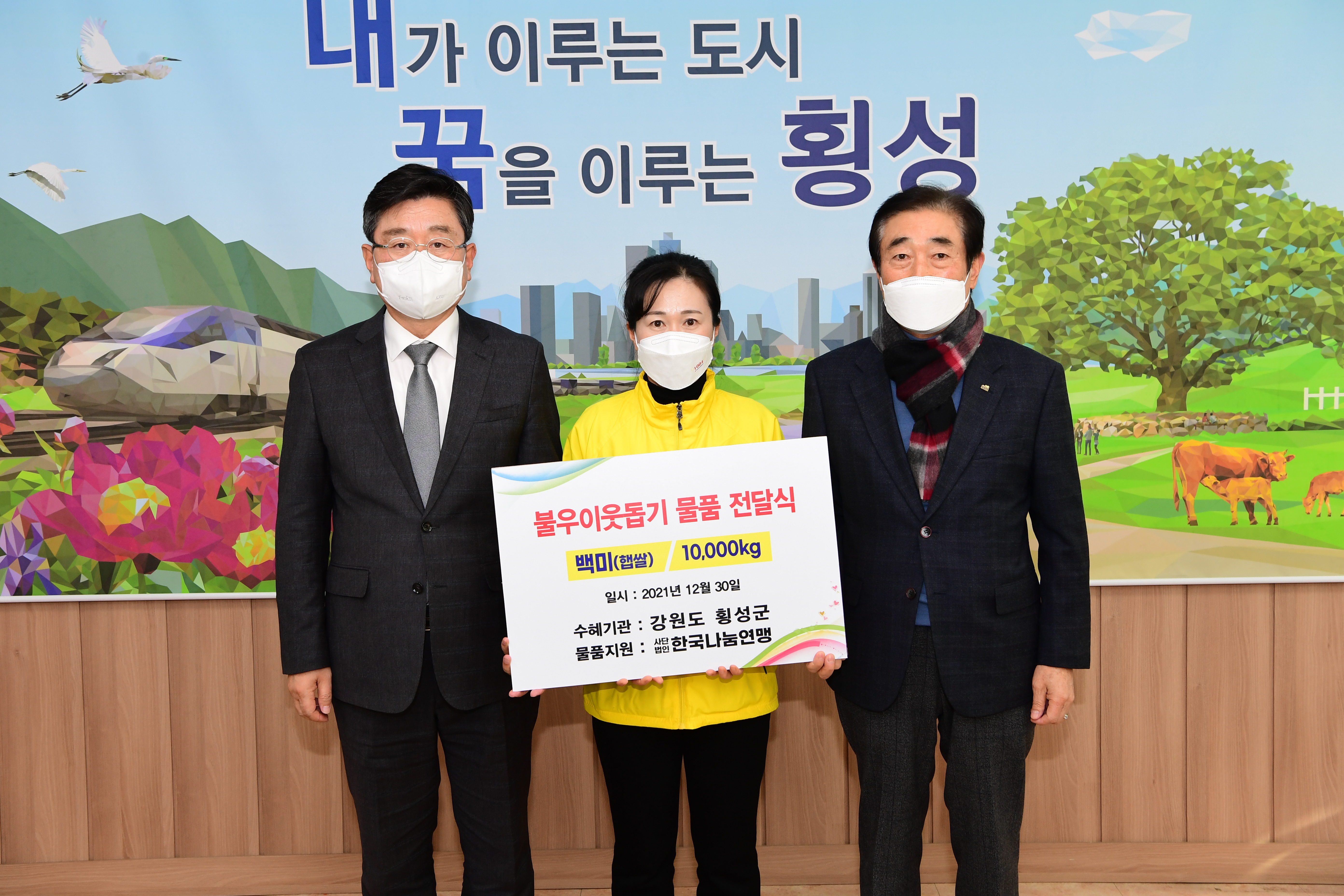 [강원사회복지신문 홍기한 기자]=(사)한국나눔연맹(이사장 안미란)은 지난 12월 30일, 오후 1시 30분 횡성군청 군수집무실을 방문하여 쌀(20kg) 500포를 희망2022나눔캠페인 '횡성행복나눔성금'에 기탁하고 전달식을 가졌다. 이날 전달식에는 (사)한국나눔연맹 홍보팀 강현애 부장이 참석하였으며 전달된 후원품은 읍면행정복...