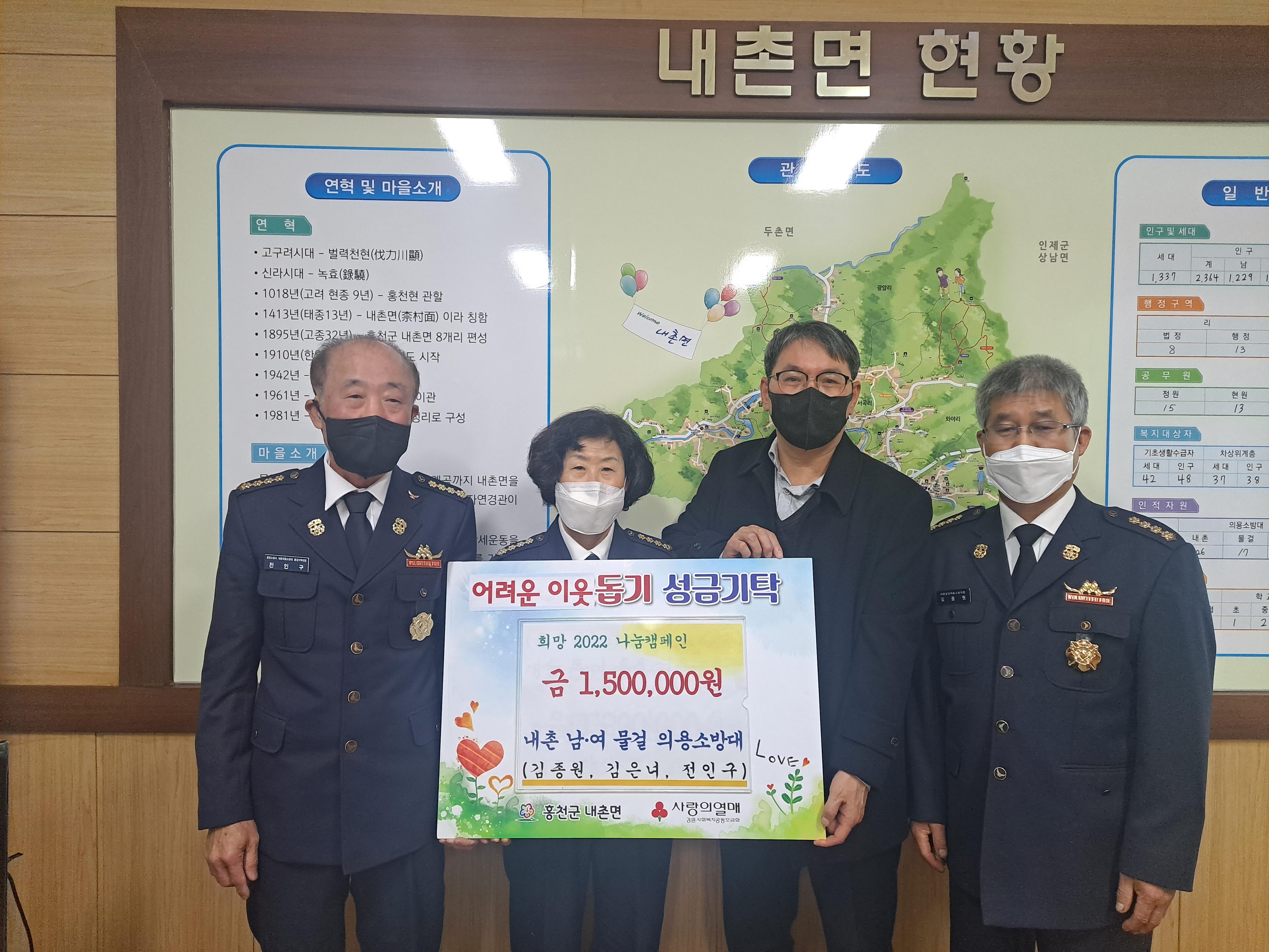 [강원사회복지신문 최재석 기자]=홍천군 내촌면 남녀 의용소방대(남성대장 김종원, 여성대장 김은녀)와 물걸 의용소방대(대장 전인구)는 지난 12월 23일 홍천군 내촌면 행정복지센터를 방문, 어려운 이웃돕기 성금 150만원을 기탁했다. 전인구 대장은 “내촌면 남녀 의용소방대와 물걸 의용소방대 3곳 회원들의 정성을 모아 ...