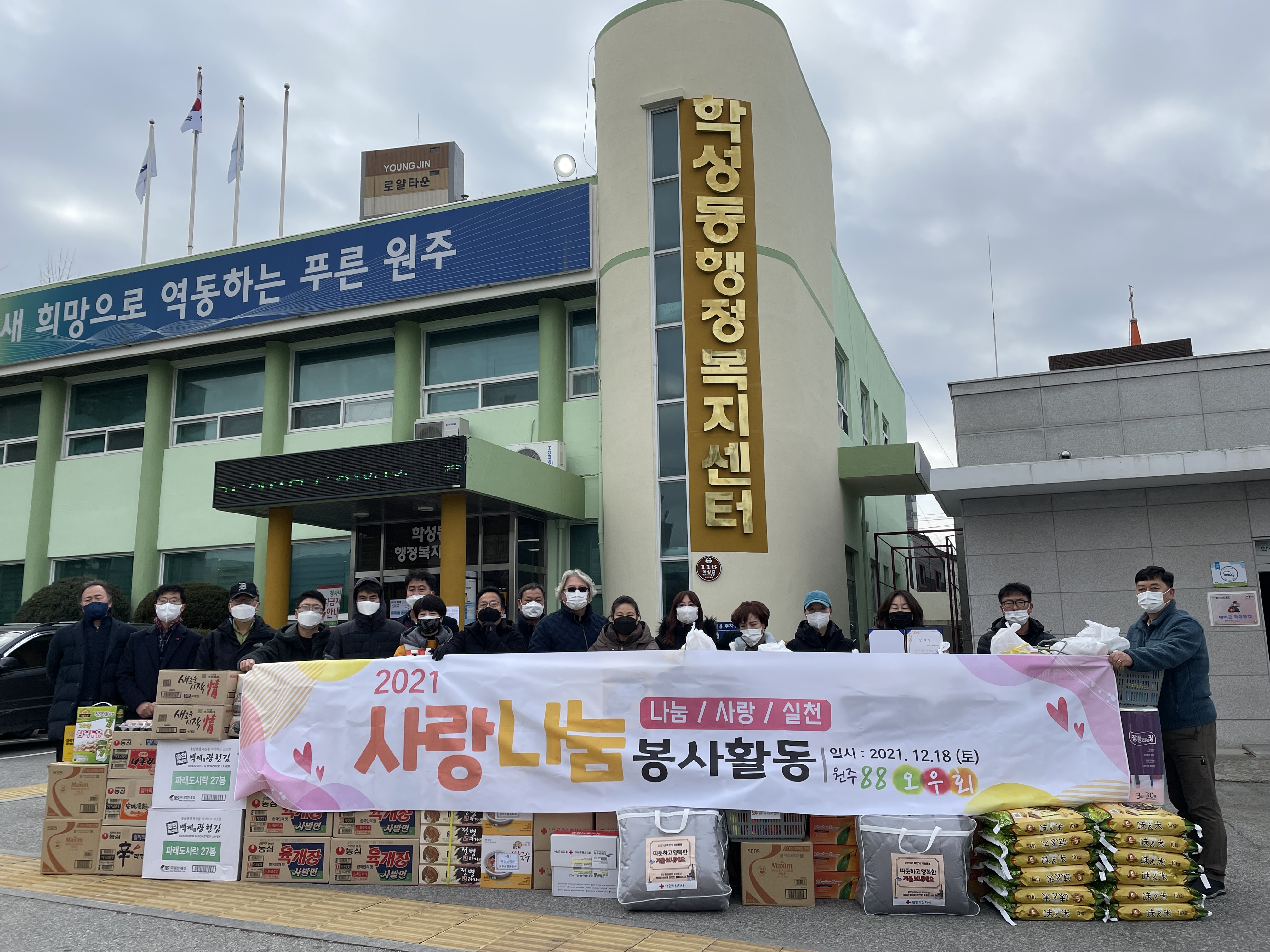 [강원사회복지신문 서은진 기자]=1988년 지역 고등학교 졸업생 모임인 원주88오우회(회장 최성란)는 지난 12월 18일 원주시 학성동 어려운 이웃 10가구와 새터민 2가구에 라면, 세제, 과일 등 500만 원 상당의 후원물품 16종을 전달했다.