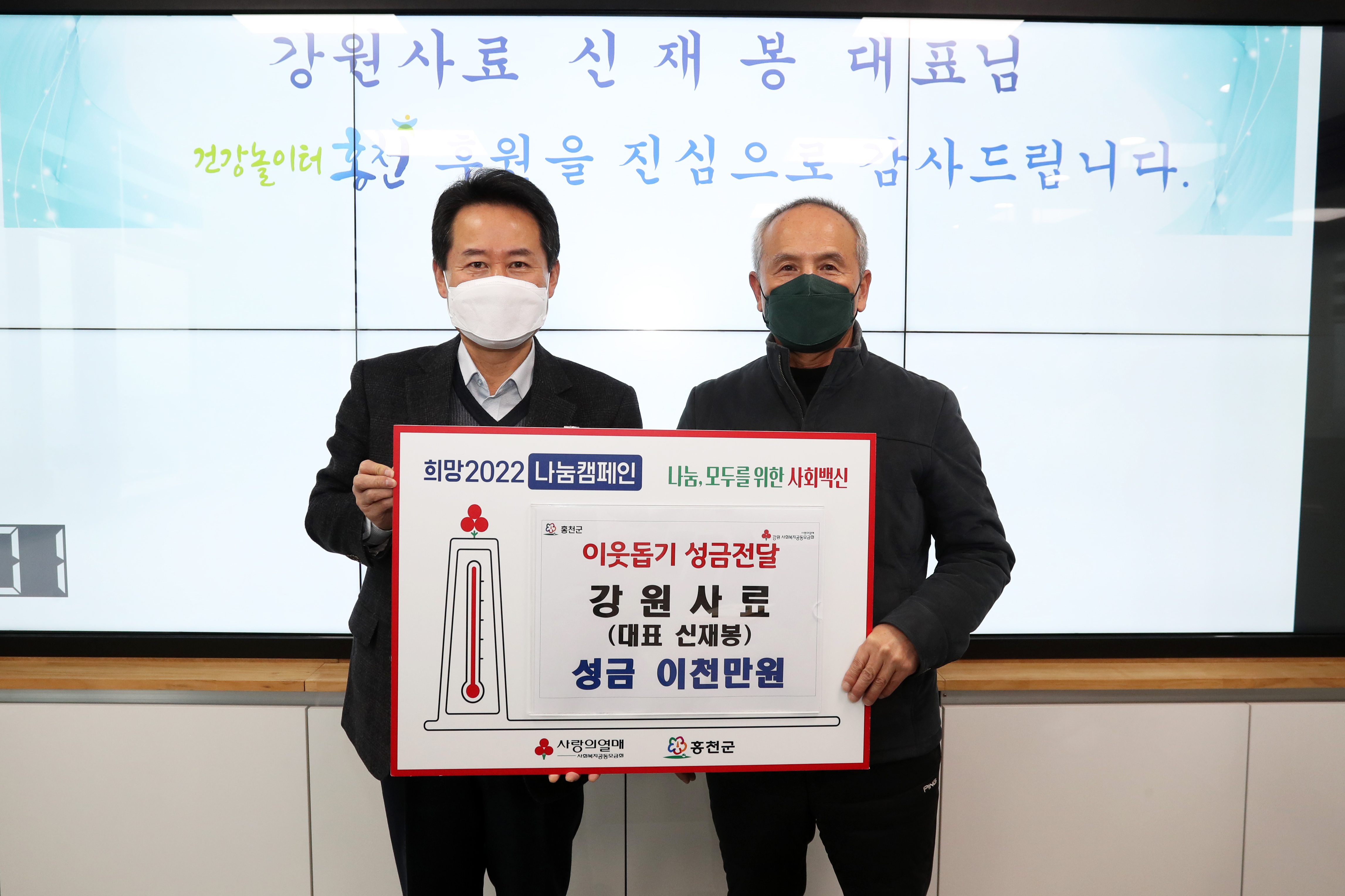 [강원사회복지신문 서은진 기자]=강원사료(대표 신재봉)는 지난 12월 21일 홍천군청을 방문, '희망2022 나눔 캠페인' 성금으로 2,000만원을 기탁했다. 홍천읍 장전평리에서 한우 사료를 생산하고 있는 강원사료는 지난 2009년부터 관내 저소득층에 정기 후원을 하고 있으며, 매년 연말에는 이웃돕기 성금을 기탁하고 있다. 신...