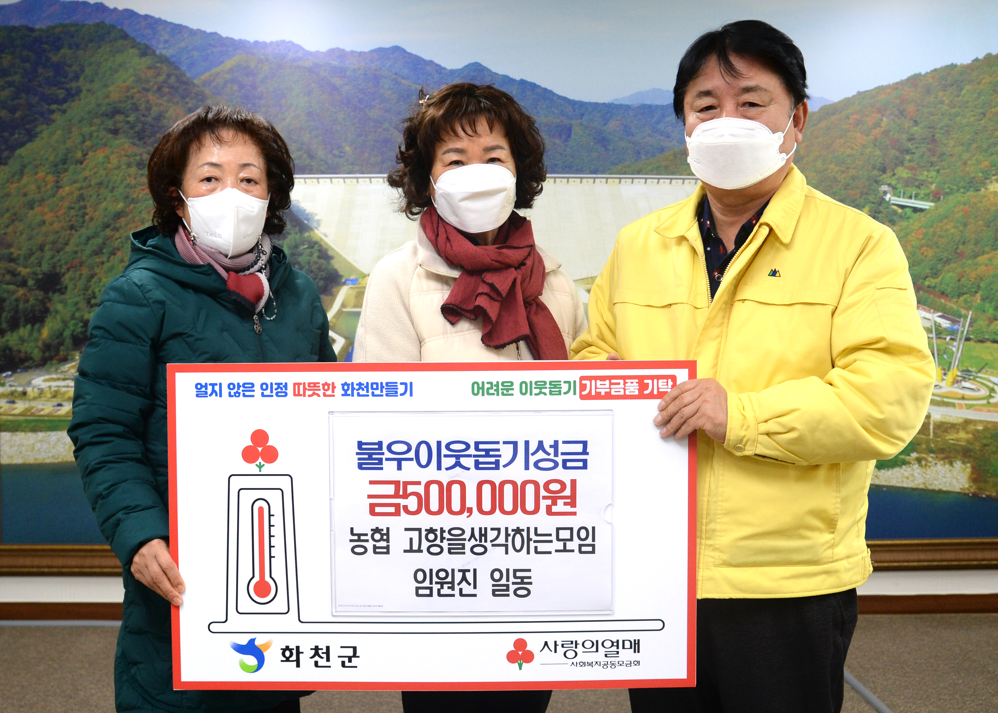 [강원사회복지신문 이정환 기자]='농협 고향을 생각하는 모임'(회장:김옥수) 임원진들은 지난 12월 21일 최문순 화천군수를 방문해 이웃돕기 성금 50만원을 기탁했다.