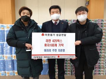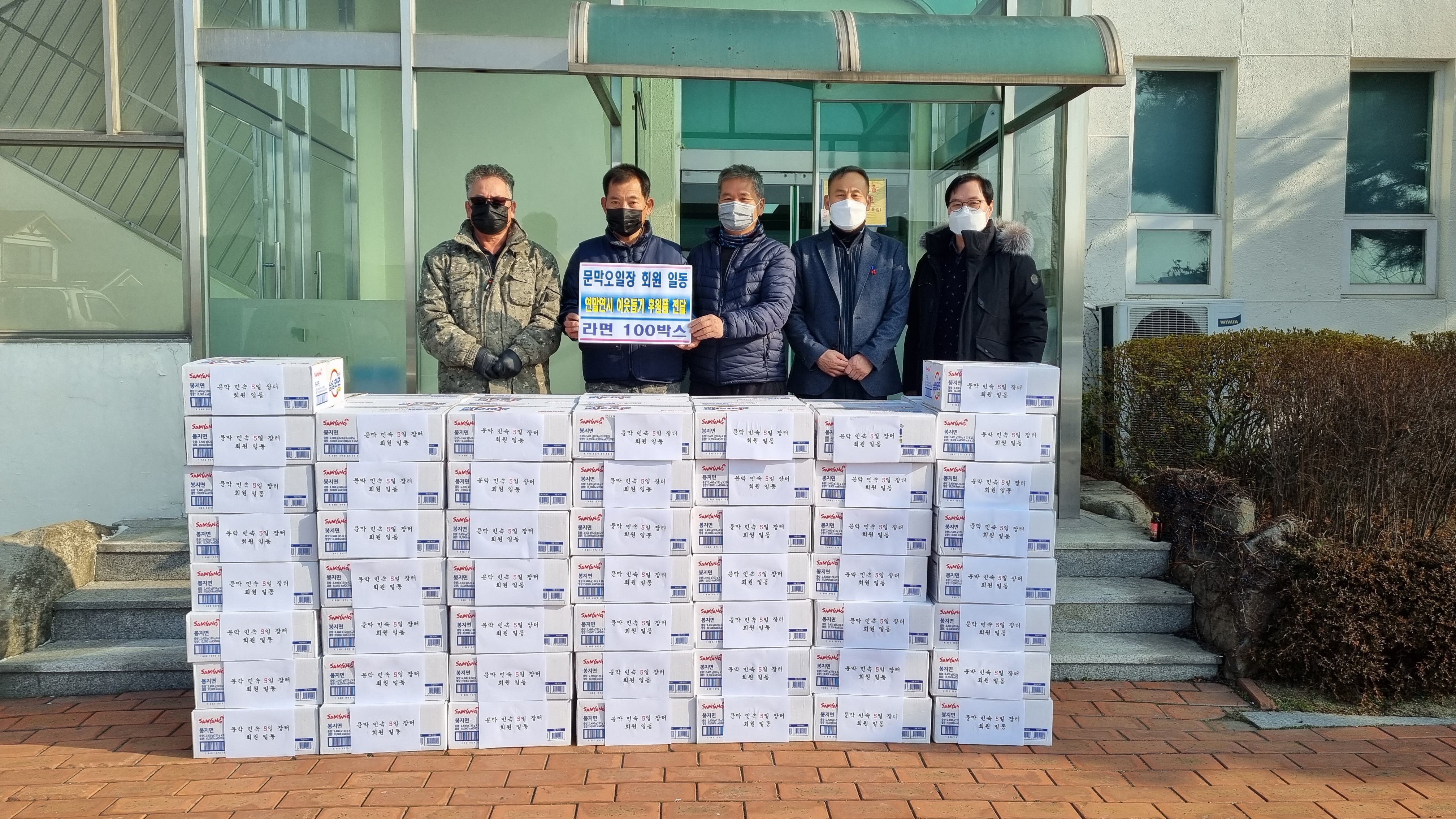 [강원사회복지신문 홍기한 기자]=원주시 문막 민속 5일 장터 회원 일동은 지난 12월 23일 연말연시 어려운 이웃에게 전달해 달라며 라면 100박스를 원주시 문막읍 행정복지센터에 기탁했다.