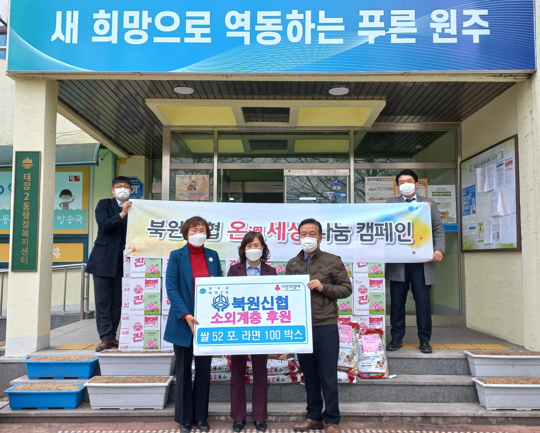 [강원사회복지신문 유경수 기자]=원주 북원신협(이사장 우광현)은 지난 12월 14일 지역 소외계층을 위해 백미(10kg) 52포와 라면 100박스를 원주시 태장2동 행정복지센터(동장 정은일)에 전달했다.