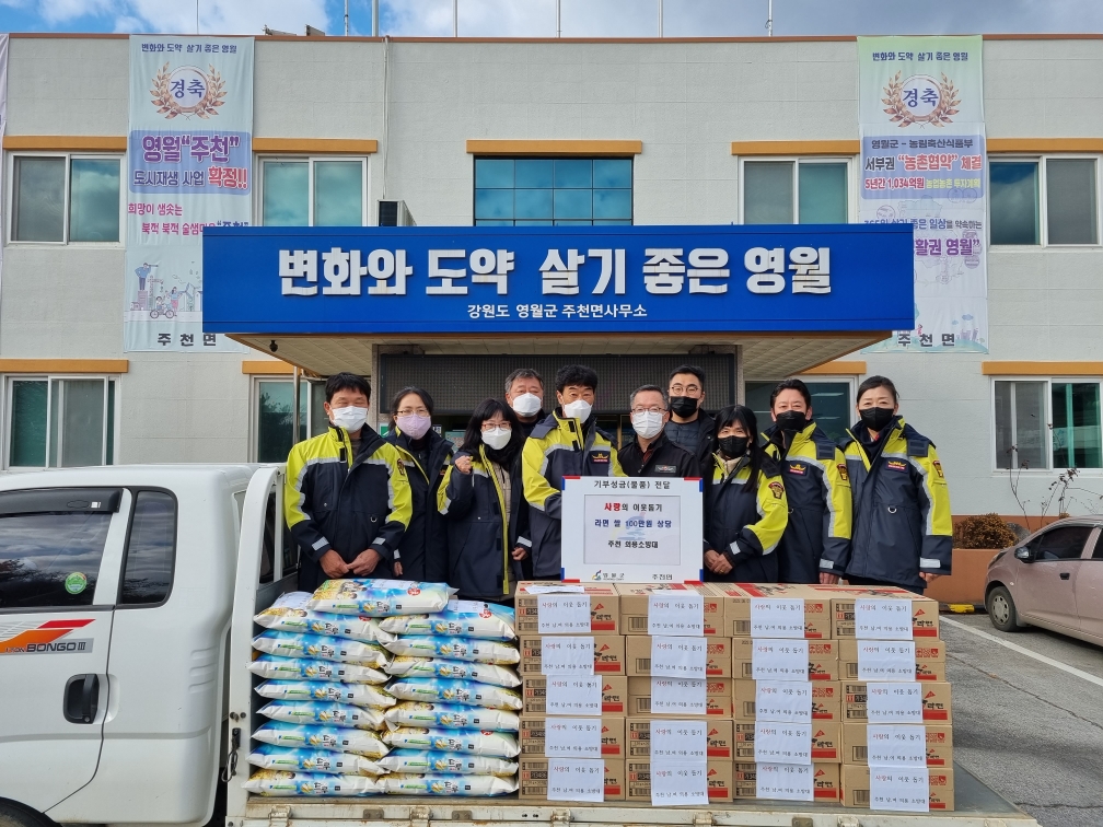[강원사회복지신문 이정환 기자]=영월군 주천면 의용소방대(의용소방대장 : 이근석, 여성의용소방대장 : 이명숙)에서는 지역 내 저소득 이웃을 돕기 위해 100만원 상당의 라면과 쌀을 주천면에 후원했다. 의용소방대 이근석대장은 "자그마한 나눔이 어려운 이웃에게 도움이 될 수 있다면 큰 기쁨이며 앞으로도 기회가 되면 나...