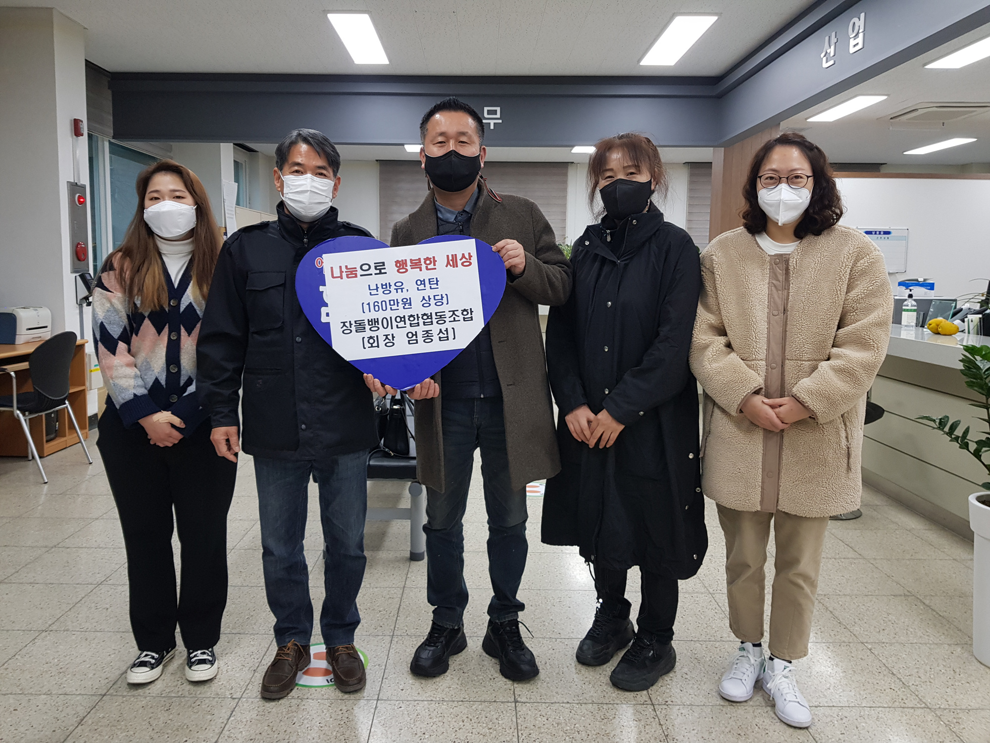 [강원사회복지신문 홍기한 기자]=장돌뱅이연합협동조합(조합장 엄종섭)에서는 어려운 이웃을 위해 써달라며 난방유 및 연탄(160만원 상당)을 영월군 상동읍에 기탁했다. 엄종섭 조합장은 "동절기에 소외되고 어려운 이웃을 위해 조금이나마 힘이 되기 바라며 앞으로도 나눔실천에 앞장서겠다."고 전했다.