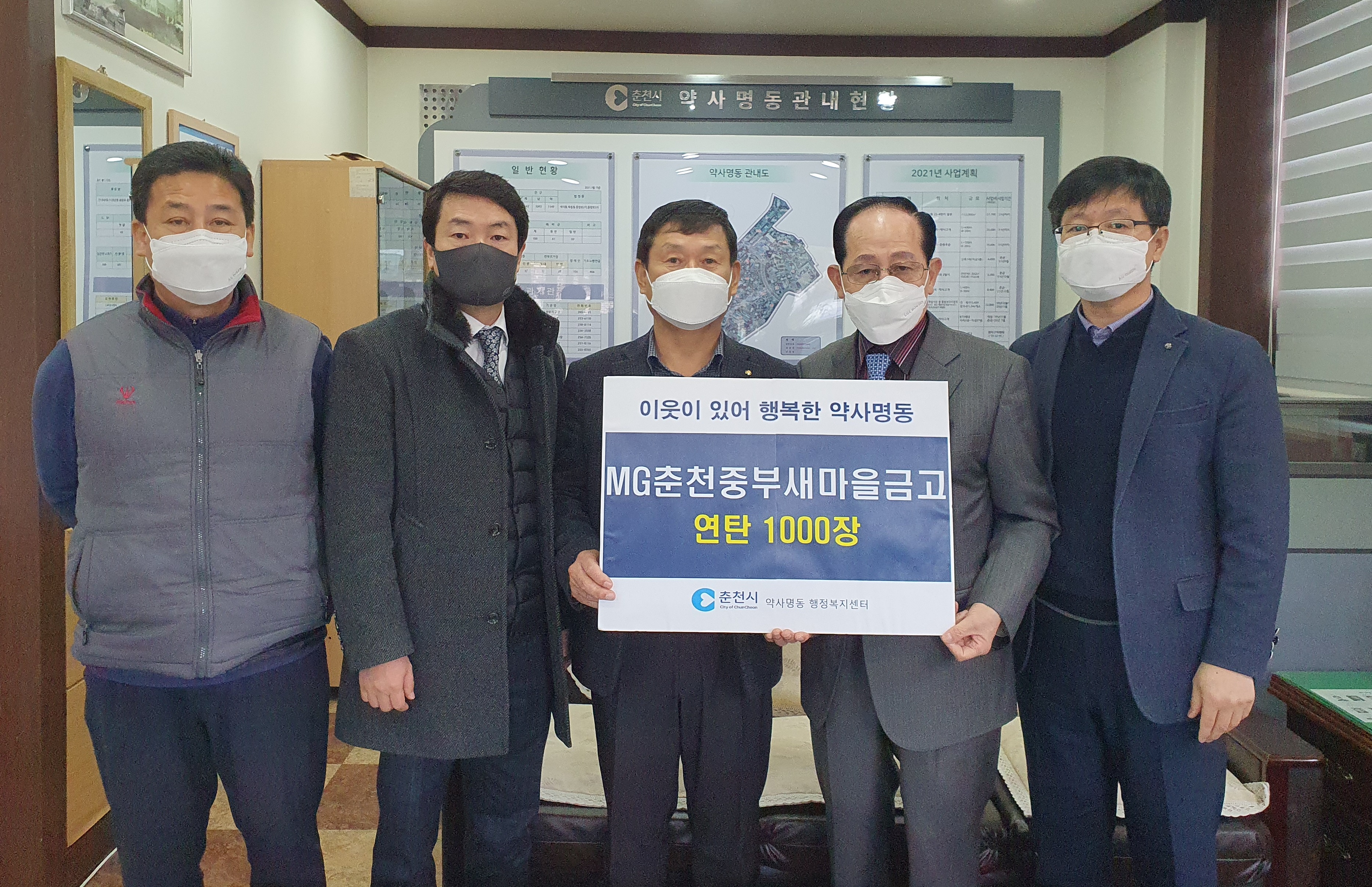 [강원사회복지신문 유경수 기자]=MG춘천중부새마을금고(이사장:최철희)는 지난 12월 14일 오전 11시 약사명동행정복지센터에서 (사)춘천연탄은행을 통해 약사명동에 거주하는 취약계층 5가구에게 연탄 200장씩 총 1,000장을 후원했다.