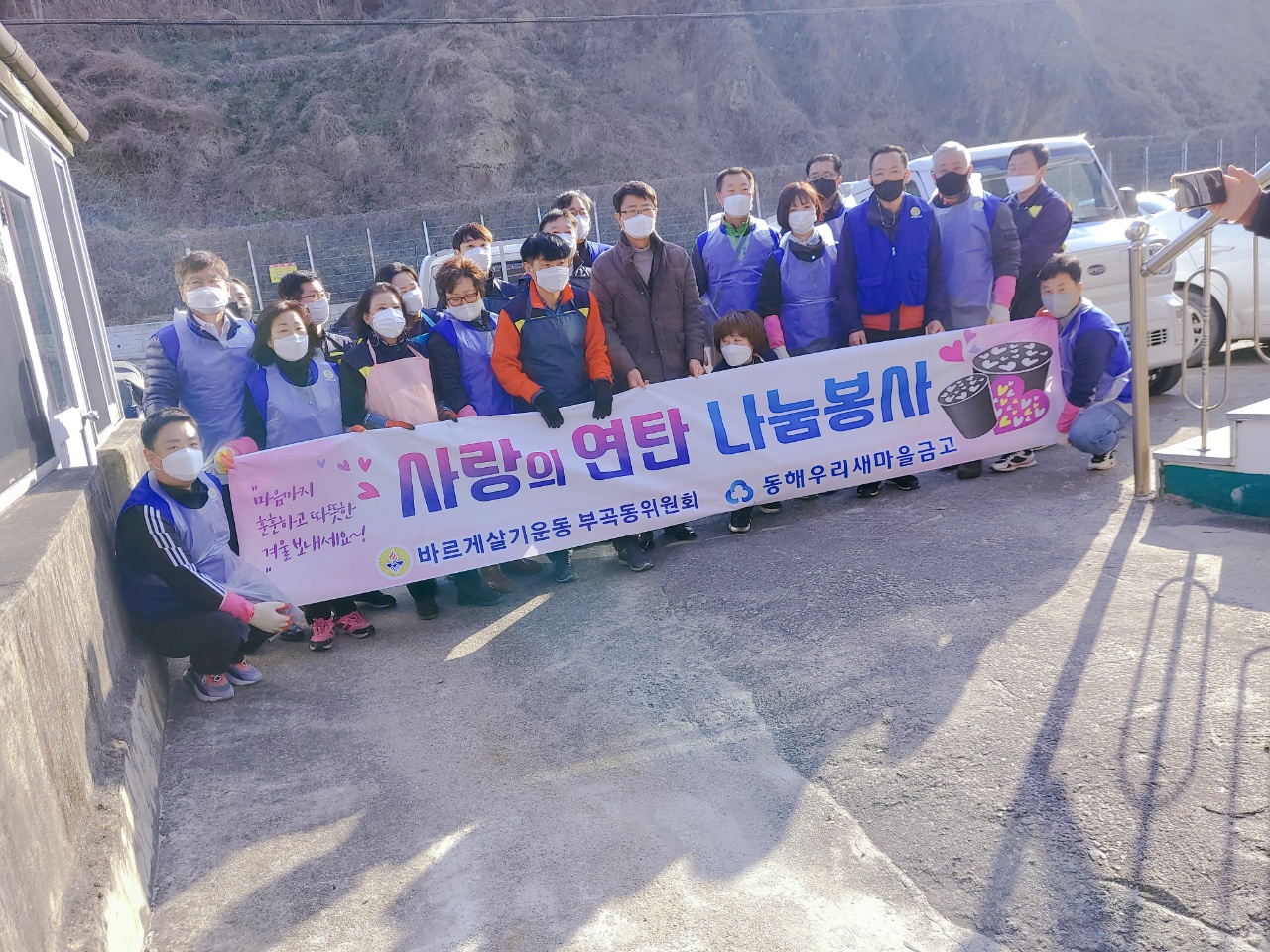 [강원사회복지신문 서은진 기자]=바르게살기운동 부곡동위원회(위원장 최정용)에서 동해우리새마을금고(이사장 김형수) 후원으로 지난 12월 12일 관내 저소득 취약계층 3가구에게 연탄 1,500장(가구당 500장)을 전달했다. 이날 봉사활동에는 바르게살기운동 부곡동위원회 위원 및 동해우리새마을금고 임직원 등 25명이 참여하...