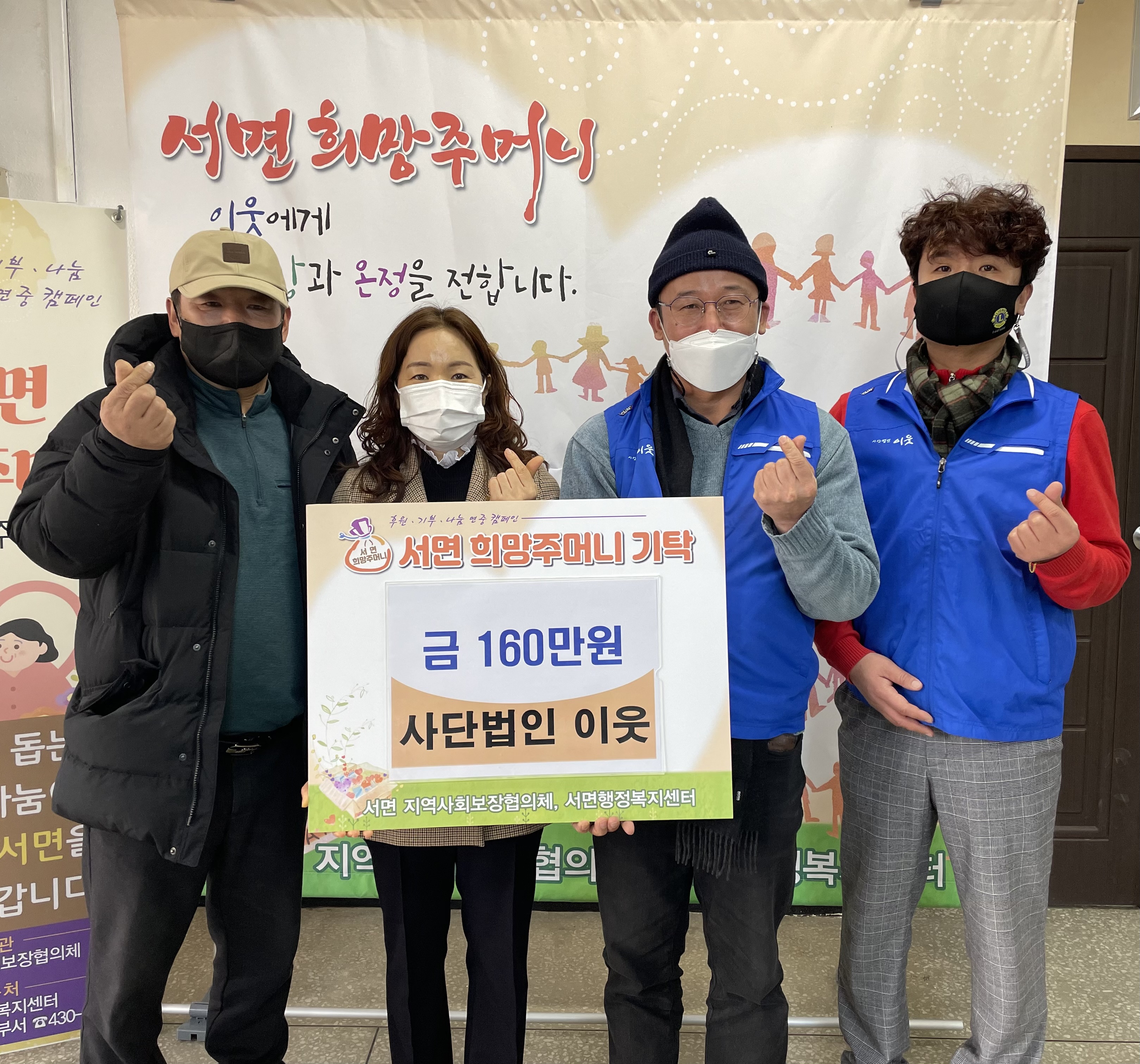 [강원사회복지신문 홍기한 기자]=(사)이웃(이사장 박학천)은 지난 12월 14일 홍천군 서면 행정복지센터를 방문, '서면 희망주머니'에 성금 160만원을 기탁했다. 2018년 7월 20일 설립된 (사)이웃은 연탄 나눔 및 에너지 지원, 한 부모 및 조손가정을 위한 교육비 지원, 주거환경개선사업 등 아름다운 지역공동체 사회를 만드...