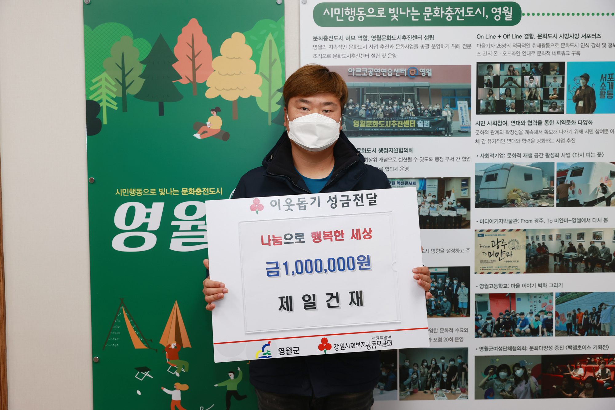 [강원사회복지신문 홍기한 기자]=제일건재(대표 공근배)에서는 지난 12월 14일 100만원의 성금을 영월군에 기탁하였다. 기탁자는 "평소 어려운 이웃을 돕고 싶은 마음이 있었으나 실천하지 못해 영월에 전입 온지 1년이 된 시점에 기념하여 나눔에 동참하게 되었으며, 앞으로도 다방면에서 영월의 취약계층을 돕는데 앞장서겠...