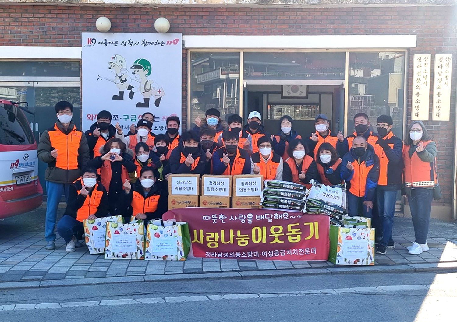 [강원사회복지신문 김종한 기자]=삼척시 정라남성의용소방대와 정라응급처지전문의용소방대는 최근 정라동 저소득가정의 행복한 겨울나기를 희망하면서 저소득 53가구를 방문해 쌀, 국수, 라면 등 '사랑의 식품꾸러미'를 전달했다.