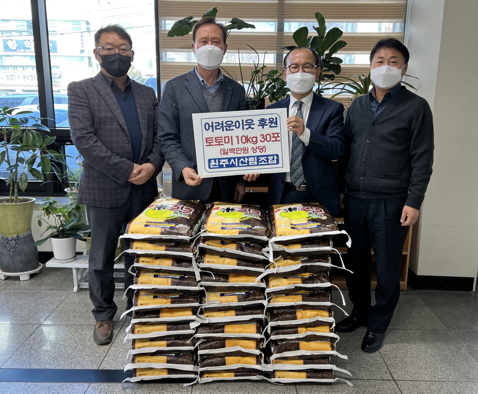 [강원사회복지신문 유경수 기자]=원주시 산림조합 조두형 조합장은 지난 12월 3일 지역 소외계층을 위해 100만 원 상당의 토토미(10kg) 30포를 원주시 봉산동 행정복지센터(동장 강정원)에 전달했다.