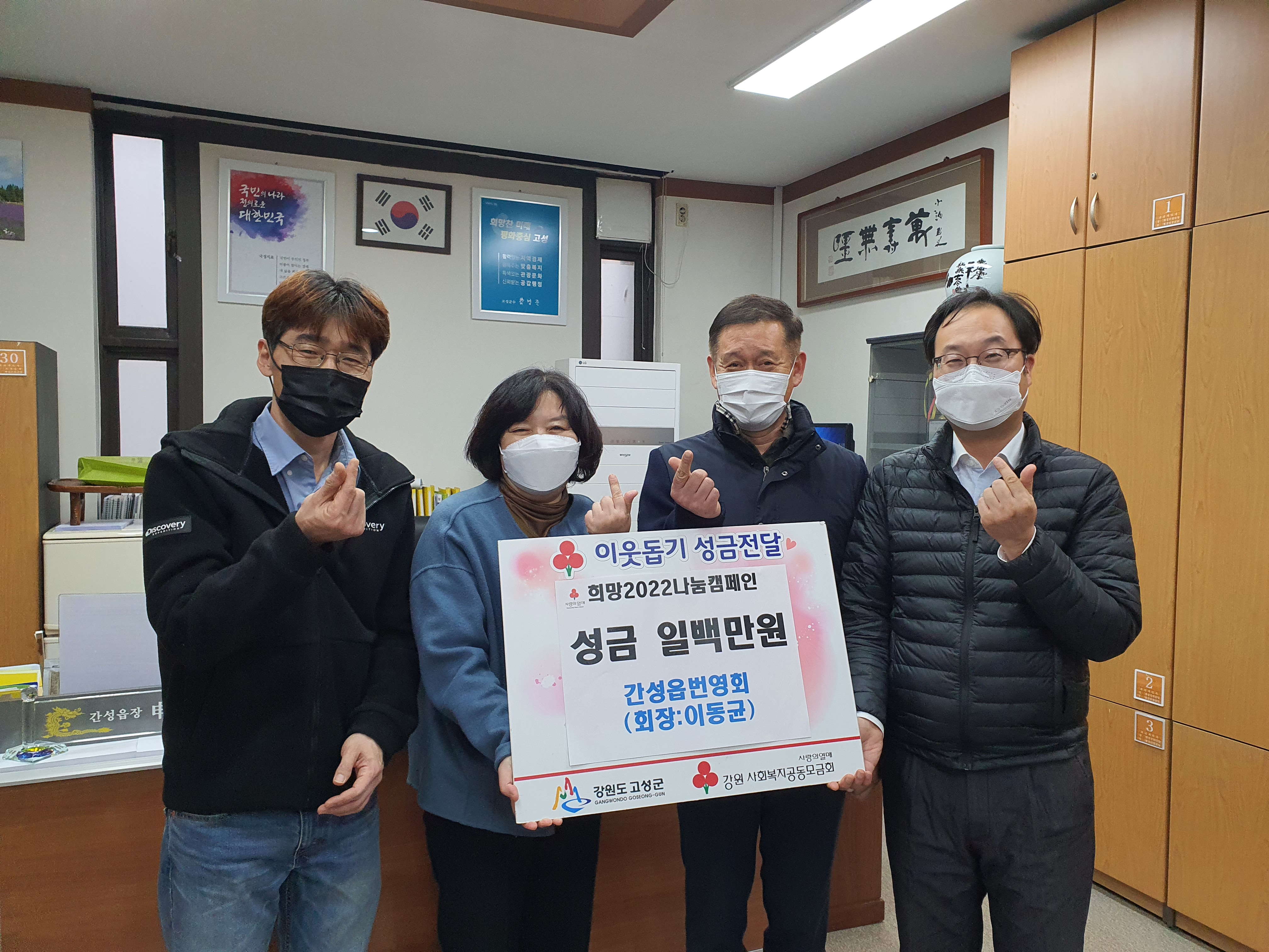 [강원사회복지신문 서은진 기자]=고성군 간성읍번영회(회장 이동균)가 지난 12월 7일(화) 간성읍 행정복지센터에 이웃돕기성금 일백만원을 기탁했다. 이동균 회장은 "간성읍번영회가 매년 간성읍 어려운 이웃들을 위해 나눔 실천에 동참하는 일이 매우 뜻깊고, 모든 이웃들이 풍요롭게 번영하길 기원하는 마음이다."라고 소감...