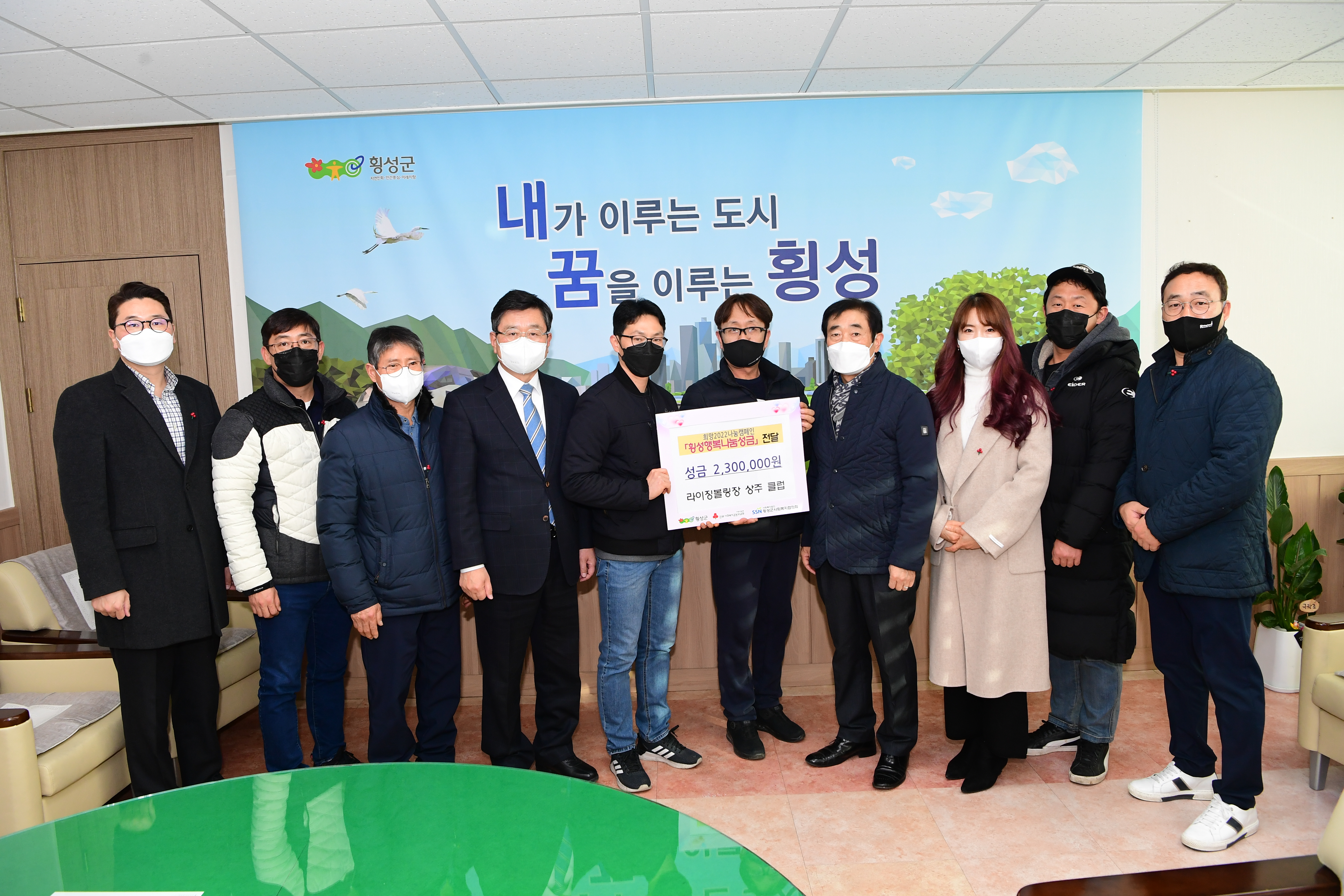 [강원사회복지신문 홍기한 기자]=라이징볼링장 상주 클럽에서는 지난 12월 8일 오후 3시 30분, 군수 집무실을 방문하여 성금 2,300천원을 '횡성행복나눔성금'에 기탁했다. 이날 전달식에는 장신상 군수와 횡성군사회복지협의회 이석원 회장, 라이징 볼링장 현명환 대표, 8개 상주 클럽 회장 등이 참석하였다. 이번 기탁금은 ...